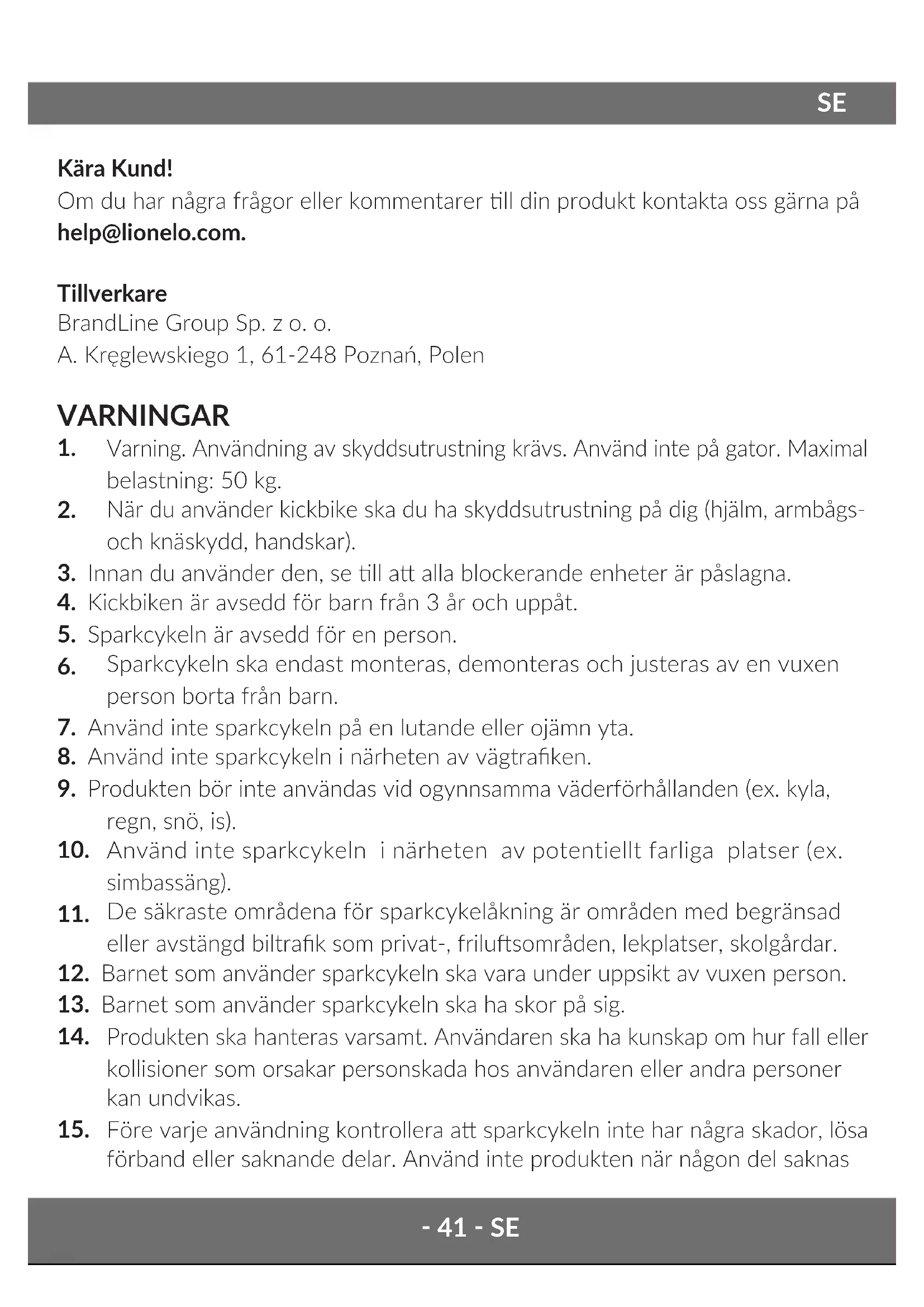 Kära Kund! Om du har några frågor eller kommentarer ll din produkt kontakta oss gärna på help@lionelo.com. Tillverkare BrandLine Group Sp. z o. o. A. Kręglewskiego 1, 61-248 Poznań, Polen VARNINGAR
