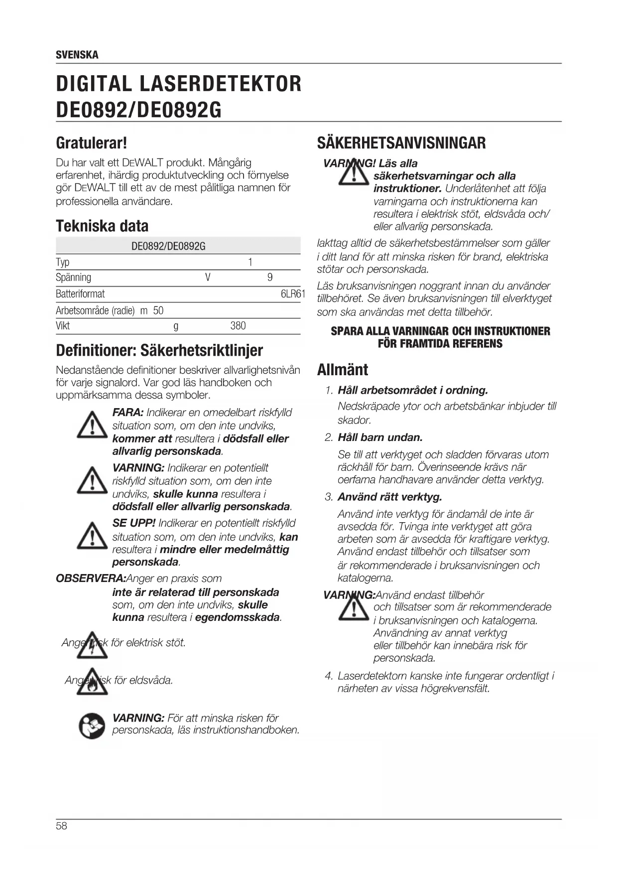 DIGITAL LASERDETEKTOR DE0892/DE0892G Gratulerar! Du har valt ett DeWALT produkt. Mångårig erfarenhet, ihärdig produktutveckling och förnyelse gör DeWALT till ett av de mest pålitliga namnen för professionella användare. Tekniska data DE0892/DE0892G Typ 1 Spänning V 9 Batteriformat 6LR61 Arbetsområde (radie) m 50 Vikt g 380 Definitioner: Säkerhetsriktlinjer Nedanstående definitioner beskriver allvarlighetsnivån för varje signalord. Var god läs handboken och uppmärksamma dessa symboler. FARA: Indikerar en omedelbart riskfylld situation som, om den inte undviks, kommer att resultera i dödsfall eller allvarlig personskada. VARNING: Indikerar en potentiellt riskfylld situation som, om den inte undviks, skulle kunna resultera i dödsfall eller allvarlig personskada. SE UPP! Indikerar en potentiellt riskfylld situation som, om den inte undviks, kan resultera i mindre eller medelmåttig personskada. OBSERVERA: Anger en praxis som inte är relaterad till personskada som, om den inte undviks, skulle kunna resultera i egendomsskada. Anger risk för elektrisk stöt. Anger risk för eldsvåda. VARNING: För att minska risken för personskada, läs instruktionshandboken. SÄKERHETSANVISNINGAR VARNING! Läs alla säkerhetsvarningar och alla instruktioner. Underlåtenhet att följa varningarna och instruktionerna kan resultera i elektrisk stöt, eldsvåda och/ eller allvarlig personskada. Iakttag alltid de säkerhetsbestämmelser som gäller i ditt land för att minska risken för brand, elektriska stötar och personskada. Läs bruksanvisningen noggrant innan du använder tillbehöret. Se även bruksanvisningen till elverktyget som ska användas met detta tillbehör.