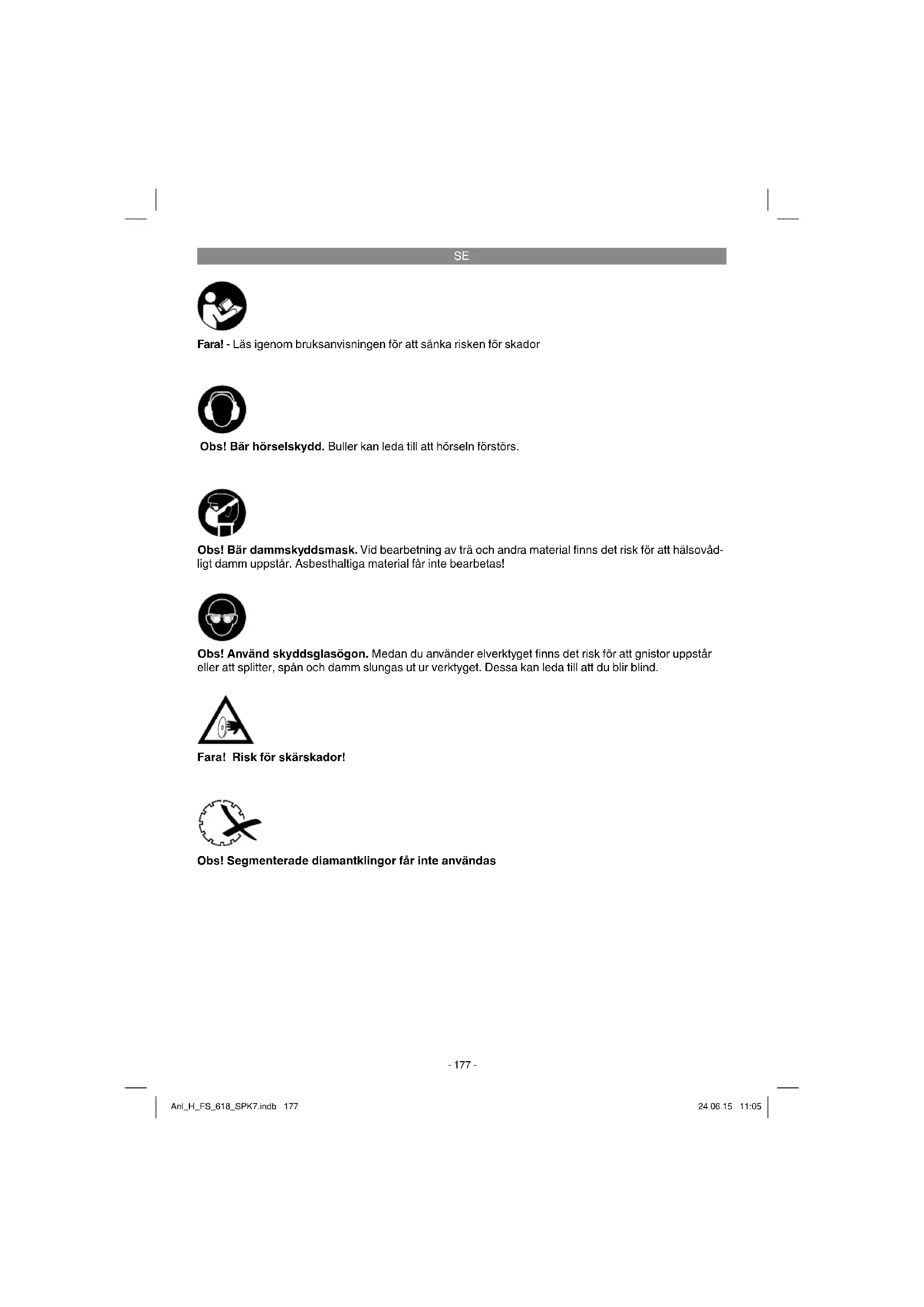 Fara! Risk för skärskador! Obs! Segmenterade diamantklingor får inte användas Fara! - Läs igenom bruksanvisningen för att sänka risken för skador Obs! Bär hörselskydd. Buller kan leda till att hörseln förstörs. Obs! Använd skyddsglasögon. Medan du använder elverktyget fi nns det risk för att gnistor uppstår eller att splitter, spån och damm slungas ut ur verktyget. Dessa kan leda till att du blir blind. Obs! Bär dammskyddsmask. Vid bearbetning av trä och andra material fi nns det risk för att hälsovåd- ligt damm uppstår. Asbesthaltiga material får inte bearbetas! Anl_H_FS_618_SPK7.indb 177Anl_H_FS_618_SPK7.indb 177 24.06.15 11:0524.06.15 11:05SE