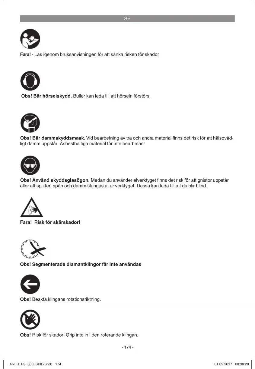 Fara! Risk för skärskador! Obs! Segmenterade diamantklingor får inte användas Fara! - Läs igenom bruksanvisningen för att sänka risken för skador Obs! Bär hörselskydd. Buller kan leda till att hörseln förstörs. Obs! Använd skyddsglasögon. Medan du använder elverktyget fi nns det risk för att gnistor uppstår eller att splitter, spån och damm slungas ut ur verktyget. Dessa kan leda till att du blir blind. Obs! Bär dammskyddsmask. Vid bearbetning av trä och andra material fi nns det risk för att hälsovåd- ligt damm uppstår. Asbesthaltiga material får inte bearbetas! Obs! Risk för skador! Grip inte in i den roterande klingan. Obs! Beakta klingans rotationsriktning. Anl_H_FS_800_SPK7.indb 174Anl_H_FS_800_SPK7.indb 174 01.02.2017 08:38:2001.02.2017 08:38:20SE