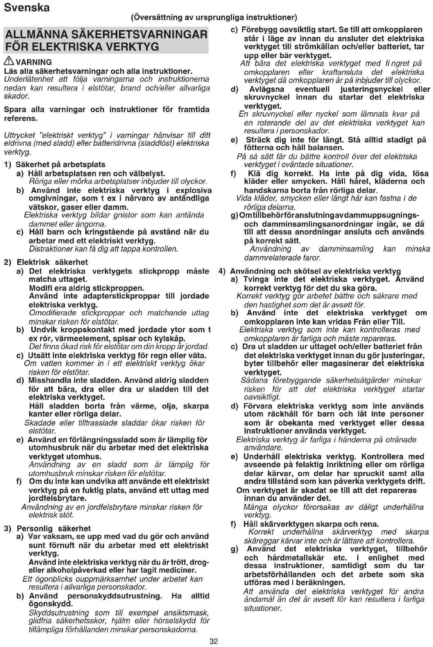 VARNING Läs alla säkerhetsvarningar och alla instruktioner. Underlåtenhet att följa varningarna och instruktionerna nedan kan resultera i elstötar, brand och/eller allvarliga skador. Spara alla varningar och instruktioner för framtida referens. Uttrycket ”elektriskt verktyg” i varningar hänvisar till ditt eldrivna (med sladd) eller batteridrivna (sladdlöst) elektriska verktyg.