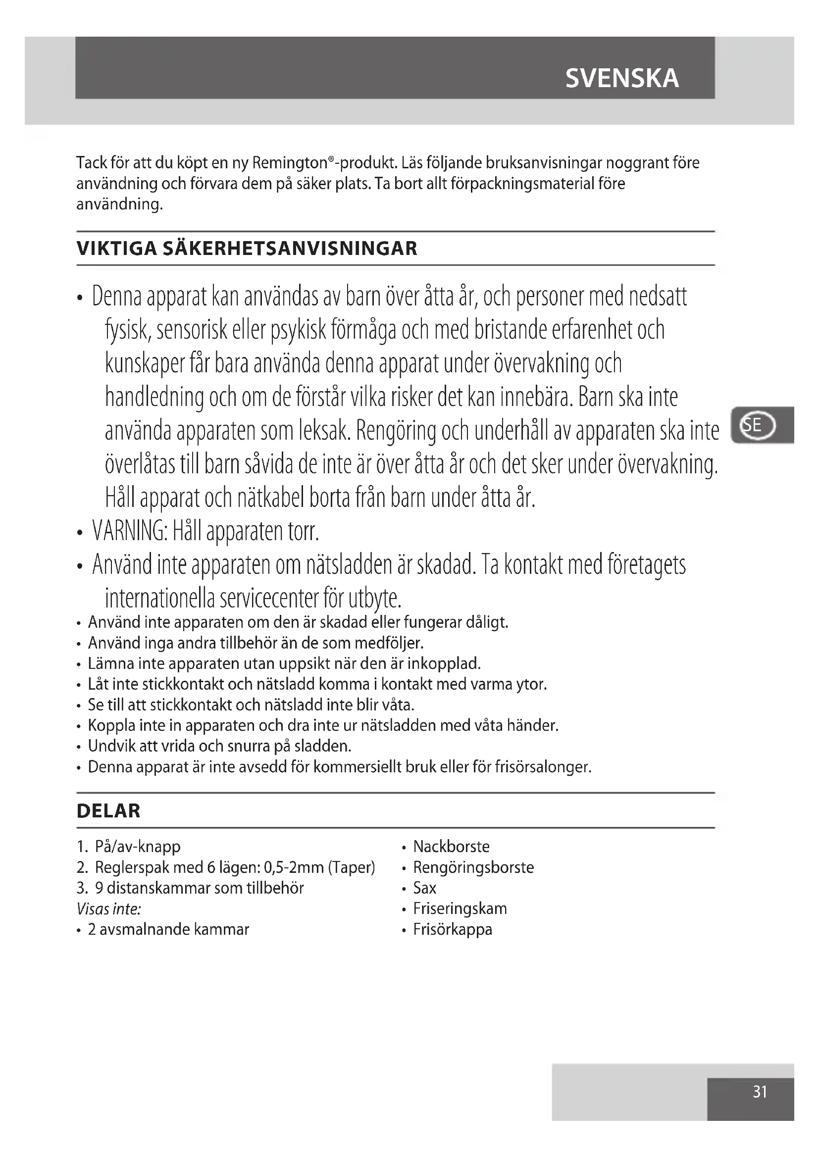 För att undvika miljö- och hälsoproblem pga. farliga ämnen får man inte kassera apparater eller laddningsbara och icke-laddningsbara batterier märkta med någon av dessa symboler i osorterat kommunalt avfall. Elektriska och elektroniska produkter och, där tillämpligt, laddningsbara och icke-laddningsbara batterier ska alltid kasseras vid en lämplig, ociell återvinnings-/uppsamlingsstation. SVENSKA35 NORSK Takk for at du kjøper et nytt Remington®-produkt. Vennligst les denne bruksanvisningen godt og legg den på et trygt sted. Fjern all emballasje før bruk. VIKTIG SIKKERHETSTILTAK