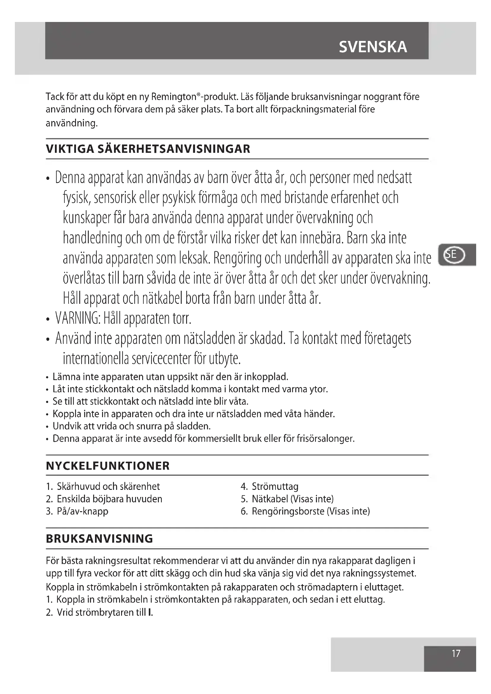 Tack för att du köpt en ny Remington®-produkt. Läs följande bruksanvisningar noggrant före användning och förvara dem på säker plats. Ta bort allt förpackningsmaterial före användning.
