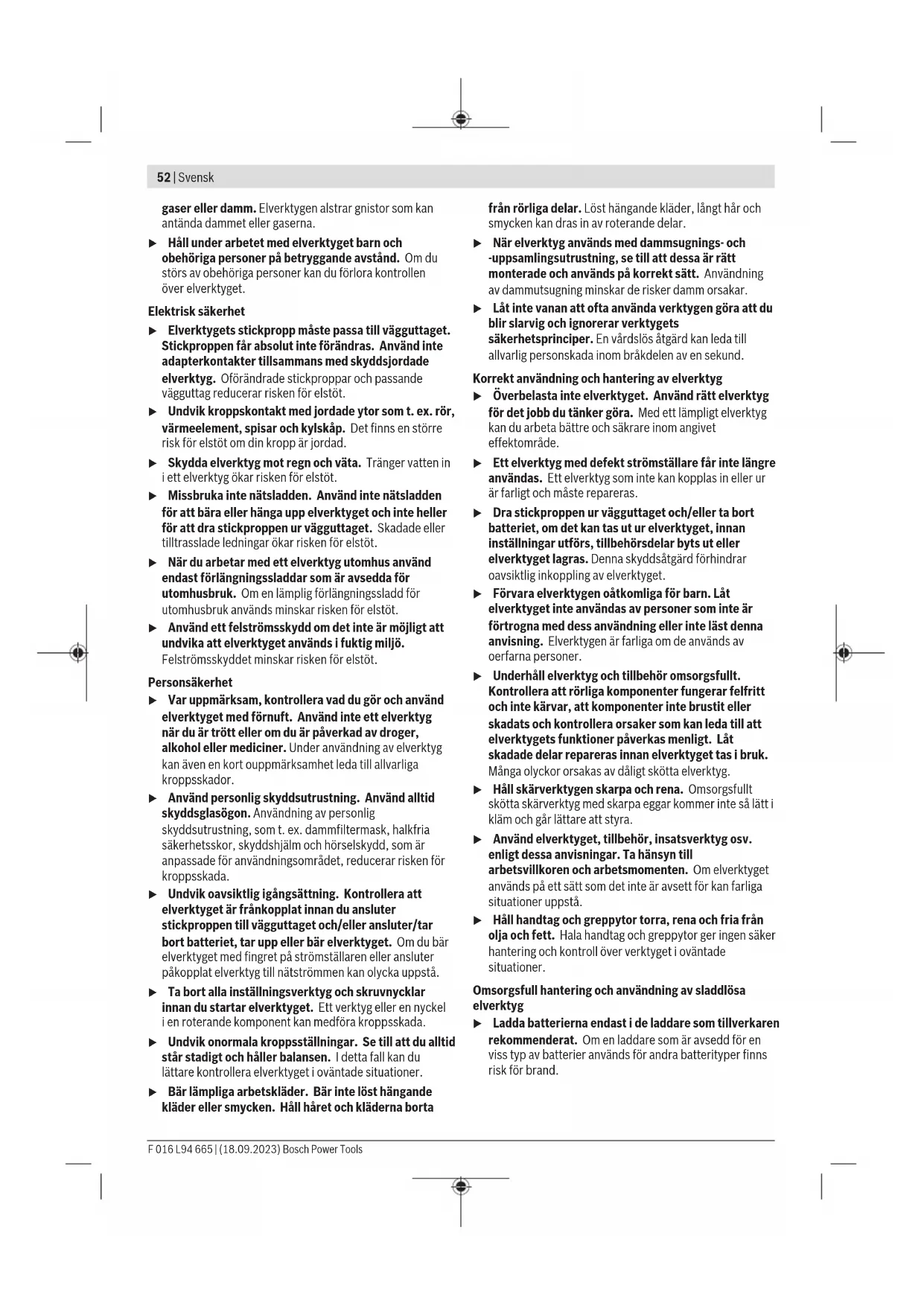 Akku er afladt Oplad akku Akkuen er ikke sat rigtigt i Sæt akkuen rigtigt i (se billede C) Akkumulatorbatteri for koldt/for varmt Opvarm/afkøl akkumulatorbatteri. Start altid produktet med et lavt omdrejningstal Haveredskab defekt Kontakt serviceforhandleren Haveredskab kører i intervaller Start-stop-kontakt er defekt Kontakt serviceforhandler Regulator til luftstrømhastighed defekt Kontakt serviceforhandleren For stor vibration/støj Haveredskab defekt Kontakt serviceforhandleren Arbejdsvarighed pr. akkuladning for lille Akku har ikke været brugt i længere tid eller kun i kort tid Oplad akku helt Akku er i stykker eller defekt Skift akku Haveredskab blæser ikke Dyse er blokeret Afbloker dyse Reduceret luftgennem- strøm Luftindgang blokeret Frigør luftindgang Akku er for kold Start altid produktet med et lavt omdrejningstal Dyse kan ikke monte- res Forkert montering Monter dysen rigtigt (se billede B) Vedligeholdelse og service Vedligeholdelse, rengøring og opbevaring u Sørg for, at reparationer på produktet kun udføres af kvalificerede fagfolk, og at der kun benyttes originale reservedele. Dermed garanteres størst mulig sikkerhed. u Beskadigede batterier må aldrig repareres. Repara- tion af batterier må kun udføres af producenten eller au- toriserede reparatører. Vedligeholdelse, rengøring og opbevaring Rengør produktet med en klud, før det lægges til opbevaring. Sørg for, at motoren er slukket, og at akkuen er fjernet, før dysen rengøres og samles. Brug aldrig opløsningsmidler. Sprøjt aldrig vand på produktet. Dyp aldrig produktet i vand. F 016 L94 665 | (18.09.2023) Bosch Power ToolsSvensk | 51 Kundeservice og anvendelsesrådgivning Kundeservice besvarer dine spørgsmål vedr. reparation og vedligeholdelse af dit produkt samt reservedele. Eksplo- sionstegninger og oplysninger om reservedele finder du også på: www.bosch-pt.com Bosch-anvendelsesrådgivningsteamet hjælper dig gerne, hvis du har spørgsmål til produkter og tilbehørsdele. Produktets 10‑cifrede typenummer (se typeskilt) skal altid angives ved forespørgsler og bestilling af reservedele. Dansk Bosch Service Center Telegrafvej 3 2750 Ballerup På www.bosch-pt.dk kan der online bestilles reservedele el- ler oprettes en reparations ordre. Tlf. Service Center: 44898855 Fax: 44898755 E-Mail: vaerktoej@dk.bosch.com Du finder adresser til andre værksteder på: www.bosch-pt.com/serviceaddresses Transport De anbefalede lithium-ion-akkuer overholder bestemmelser- ne om farligt gods. Akkuerne kan transporteres af brugeren på offentlig vej uden yderligere pålæg. Ved forsendelse gennem tredjemand (f.eks.: lufttransport el- ler spedition) skal særlige krav vedr. emballage og mærkning overholdes. Her skal man kontakte en faregodsekspert, før forsendelsesstykket forberedes. Send kun akkuer, hvis huset er ubeskadiget. Tilklæb åbne kontakter, og indpak akkuen på en sådan måde, at den ikke kan bevæge sig i emballagen. Følg venligst også eventuelle, videreførende, nationale forskrifter. Bortskaffelse Produkter, akkuer, tilbehør og emballage skal genbruges på en miljøvenlig måde. Smid hverken produkter eller akkuer/batterier ud sammen med det almindelige husholdnings- affald! Gælder kun i EU‑lande: Iht. det europæiske direktiv 2012/19/EU skal kasserede produkter og iht. det europæiske direktiv 2006/66/EF skal defekte eller opbrugte akkuer/batterier indsamles separat og genbruges iht. gældende miljøforskrifter. Ved forkert bortskaffelse kan elektrisk og elektronisk affald have skadelige virkninger på miljøet og menneskers sundhed på grund af den mulige tilstedeværelse af farlige stoffer. Akkuer/batterier: Li-Ion: Vær opmærksom på anvisningerne i afsnittet "Transport" (se "Transport", Side51). Svensk Säkerhetsanvisningar Beskrivning av symbolerna på trädgårdsredskapet Allmän varning för riskmoment. Läs noga igenom bruksanvisningen. Använd inte i regn. VARNING: Se upp för ivägslungade delar. VARNING: Håll närvarande på avstånd. Se till att du inte för händerna, fötterna eller vida kläder i öppningarna när produkten är igång. Roterande fläkt. Se till att du inte för händerna, fötterna långt hår eller vida kläder i öppningarna när produkten är igång. Använd ögon- och hörselskydd. VARNING: Avlägsna alltid batteriet före servicearbeten. Allmänna säkerhetsanvisningar för elverktyg VARNING Läs alla säkerhetsvarningar, instruktioner och specifikationer som tillhandahålls med detta elverktyg. Fel som uppstår till följd av att instruktionerna nedan inte följts kan orsaka elstöt, brand och/eller allvarliga personskador. Förvara alla varningar och anvisningar för framtida bruk. Begreppet Elverktyg hänför sig till nätdrivna elverktyg (med nätsladd) och till batteridrivna elverktyg (sladdlösa). Arbetsplatssäkerhet u Håll ditt arbetsområde rent och väl upplyst. Ostädade och mörka areor ökar olycksrisken. u Använd inte elverktyget i explosionsfarliga omgivningar när det t.ex. finns brännbara vätskor, Bosch Power Tools F 016 L94 665 | (18.09.2023)52 | Svensk gaser eller damm. Elverktygen alstrar gnistor som kan antända dammet eller gaserna. u Håll under arbetet med elverktyget barn och obehöriga personer på betryggande avstånd. Om du störs av obehöriga personer kan du förlora kontrollen över elverktyget. Elektrisk säkerhet u Elverktygets stickpropp måste passa till vägguttaget. Stickproppen får absolut inte förändras. Använd inte adapterkontakter tillsammans med skyddsjordade elverktyg. Oförändrade stickproppar och passande vägguttag reducerar risken för elstöt. u Undvik kroppskontakt med jordade ytor som t.ex. rör, värmeelement, spisar och kylskåp. Det finns en större risk för elstöt om din kropp är jordad. u Skydda elverktyg mot regn och väta. Tränger vatten in i ett elverktyg ökar risken för elstöt. u Missbruka inte nätsladden. Använd inte nätsladden för att bära eller hänga upp elverktyget