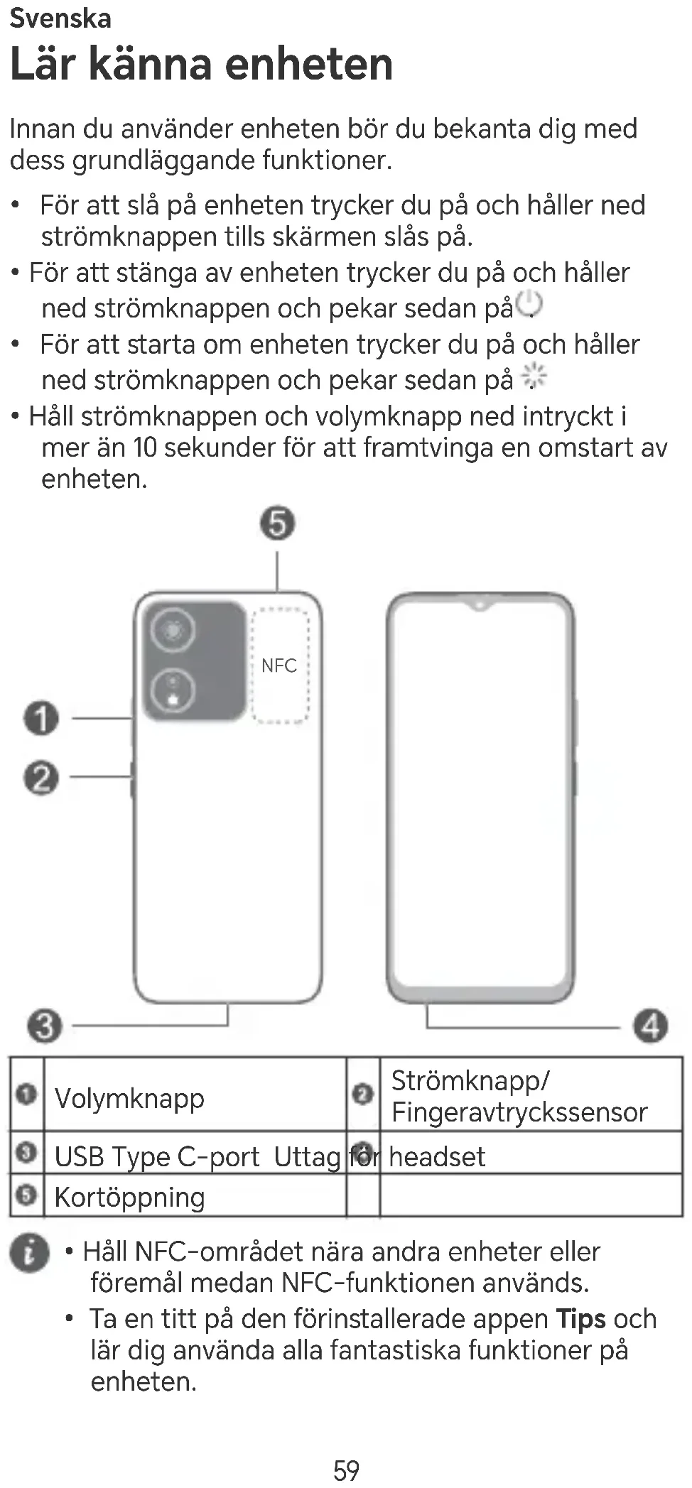 - Ta en titt på den förinstallerade appen Tips och lär dig använda alla fantastiska funktioner på enheten. 59Komma igång