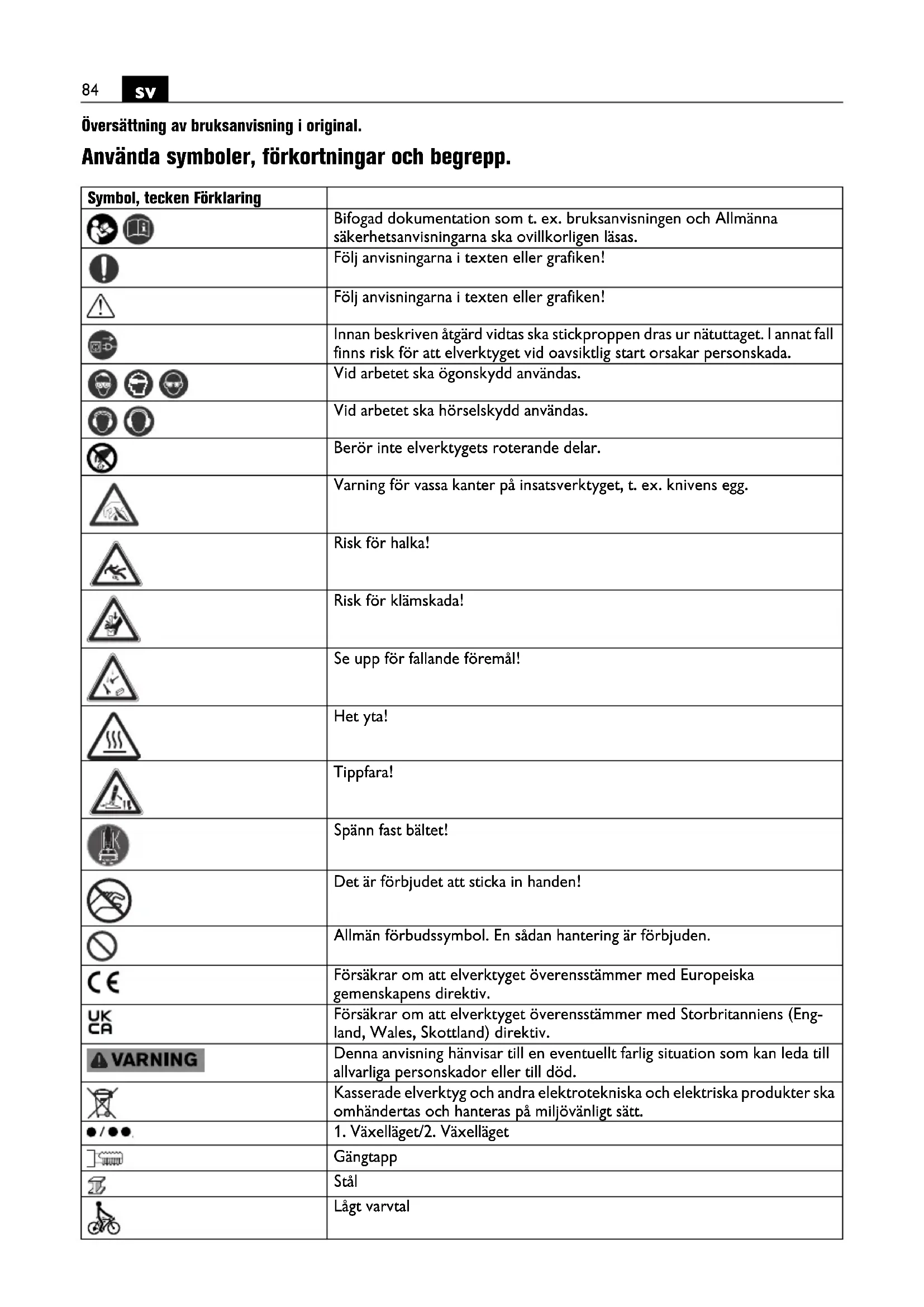 Översättning av bruksanvisning i original. Använda symboler, förkortningar och begrepp. Symbol, tecken Förklaring Bifogad dokumentation som t. ex. bruksanvisningen och Allmänna säkerhetsanvisningarna ska ovillkorligen läsas. Följ anvisningarna i texten eller grafiken! Följ anvisningarna i texten eller grafiken! Innan beskriven åtgärd vidtas ska stickproppen dras ur nätuttaget. I annat fall finns risk för att elverktyget vid oavsiktlig start orsakar personskada. Vid arbetet ska ögonskydd användas. Vid arbetet ska hörselskydd användas. Berör inte elverktygets roterande delar. Varning för vassa kanter på insatsverktyget, t. ex. knivens egg. Risk för halka! Risk för klämskada! Se upp för fallande föremål! Het yta! Tippfara! Spänn fast bältet! Det är förbjudet att sticka in handen! Allmän förbudssymbol. En sådan hantering är förbjuden. Försäkrar om att elverktyget överensstämmer med Europeiska gemenskapens direktiv. Försäkrar om att elverktyget överensstämmer med Storbritanniens (Eng- land, Wales, Skottland) direktiv. Denna anvisning hänvisar till en eventuellt farlig situation som kan leda till allvarliga personskador eller till död. Kasserade elverktyg och andra elektrotekniska och elektriska produkter ska omhändertas och hanteras på miljövänligt sätt.