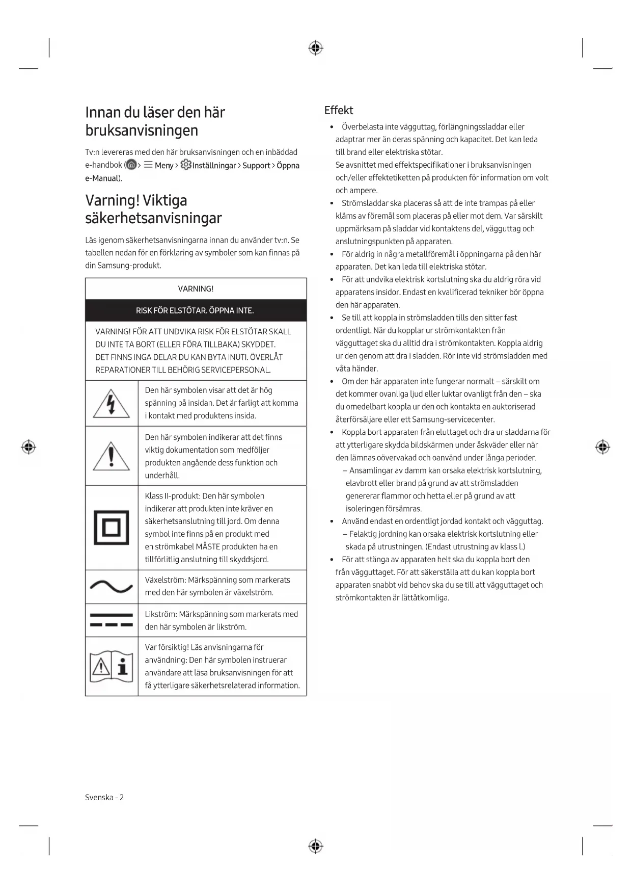 - Der Batterietyp ist modellabhängig. Deutsch - 9 DeutschInnan du läser den här bruksanvisningen Tv:n levereras med den här bruksanvisningen och en inbäddad e-handbok ( > Meny > Inställningar > Support > Öppna e-Manual). Varning! Viktiga säkerhetsanvisningar Läs igenom säkerhetsanvisningarna innan du använder tv:n. Se tabellen nedan för en förklaring av symboler som kan finnas på din Samsung-produkt. VARNING! RISK FÖR ELSTÖTAR. ÖPPNA INTE. VARNING! FÖR ATT UNDVIKA RISK FÖR ELSTÖTAR SKALL DU INTE TA BORT (ELLER FÖRA TILLBAKA) SKYDDET. DET FINNS INGA DELAR DU KAN BYTA INUTI. ÖVERLÅT REPARATIONER TILL BEHÖRIG SERVICEPERSONAL. Den här symbolen visar att det är hög spänning på insidan. Det är farligt att komma i kontakt med produktens insida. Den här symbolen indikerar att det finns viktig dokumentation som medföljer produkten angående dess funktion och underhåll. Klass II-produkt: Den här symbolen indikerar att produkten inte kräver en säkerhetsanslutning till jord. Om denna symbol inte finns på en produkt med en strömkabel MÅSTE produkten ha en tillförlitlig anslutning till skyddsjord. Växelström: Märkspänning som markerats med den här symbolen är växelström. Likström: Märkspänning som markerats med den här symbolen är likström. Var försiktig! Läs anvisningarna för användning: Den här symbolen instruerar användare att läsa bruksanvisningen för att få ytterligare säkerhetsrelaterad information. Effekt