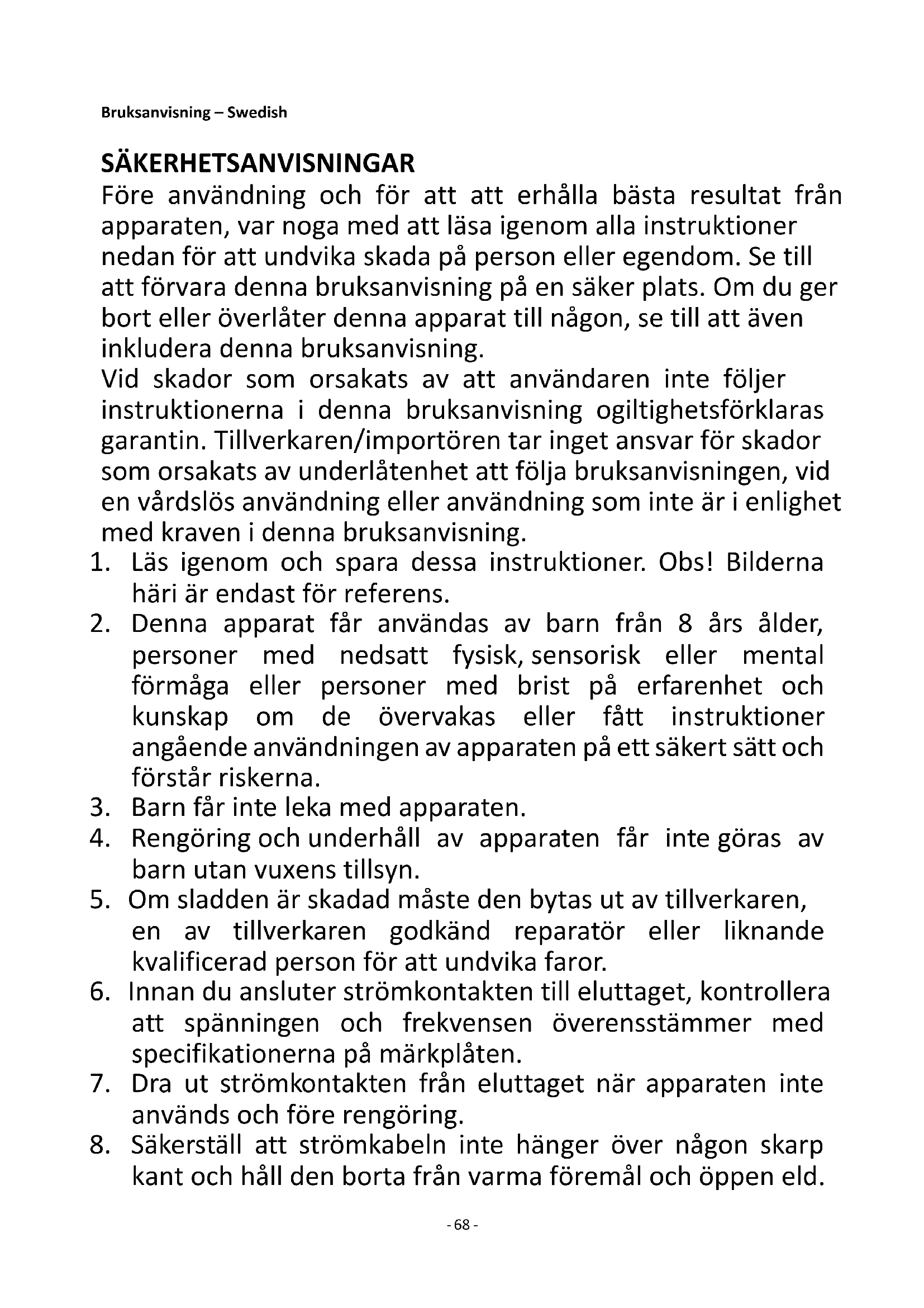 - -Bruksanvisning – Swedish SÄKERHETSANVISNINGAR Före användning och för att att erhålla bästa resultat från apparaten, var noga med att läsa igenom alla instruktioner nedan för att undvika skada på person eller egendom. Se till att förvara denna bruksanvisning på en säker plats. Om du ger bort eller överlåter denna apparat till någon, se till att även inkludera denna bruksanvisning. Vid skador som orsakats av att användaren inte följer instruktionerna i denna bruksanvisning ogiltighetsförklaras garantin. Tillverkaren/importören tar inget ansvar för skador som orsakats av underlåtenhet att följa bruksanvisningen, vid en vårdslös användning eller användning som inte är i enlighet med kraven i denna bruksanvisning.