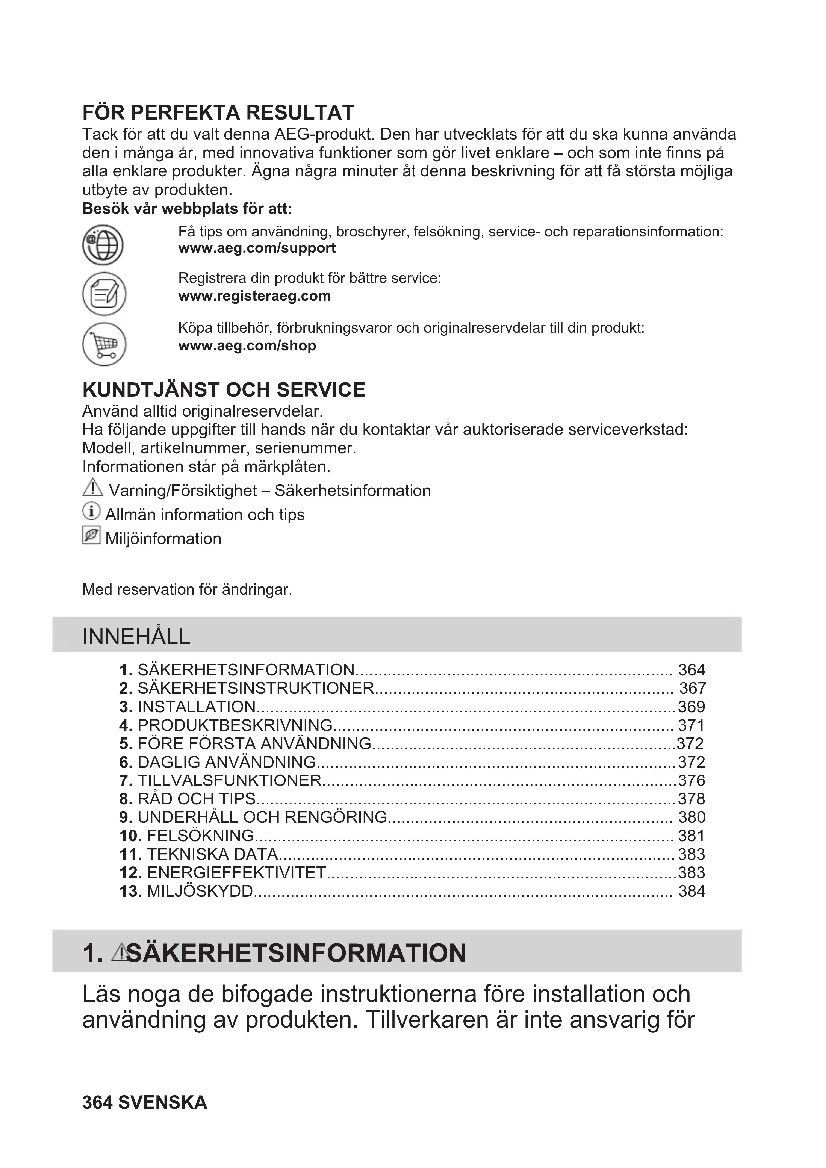 Tack för att du valt denna AEG-produkt. Den har utvecklats för att du ska kunna användaden i många år, med innovativa funktioner som gör livet enklare – och som inte finns påalla enklare produkter. Ägna några minuter åt denna beskrivning för att få största möjligautbyte av produkten.Besök vår webbplats för att:Få tips om användning, broschyrer, felsökning, service- och reparationsinformation:www.aeg.com/supportRegistrera din produkt för bättre service:www.registeraeg.comKöpa tillbehör, förbrukningsvaror och originalreservdelar till din produkt:www.aeg.com/shop