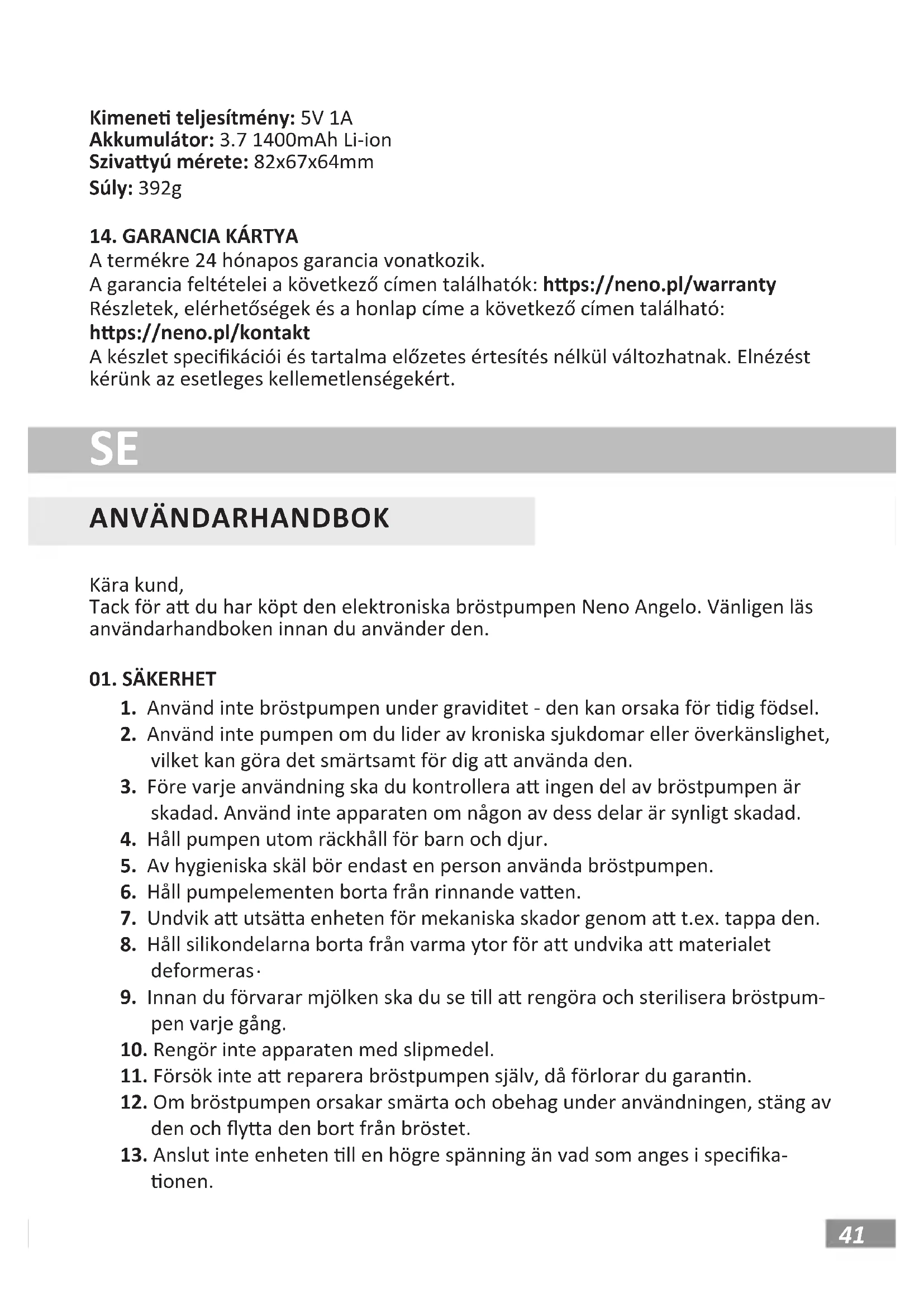 Produkten omfaas av en garan på 24 månader. Villkoren för garann nns på följande adress: hps://neno.pl/warranty Uppgier, kontaktuppgier och webbadress nns på följande adress: hps://neno.pl/kontakt Specikaoner och innehåll i satsen kan ändras utan föregående meddelande. Vi ber om ursäkt för eventuella olägenheter.