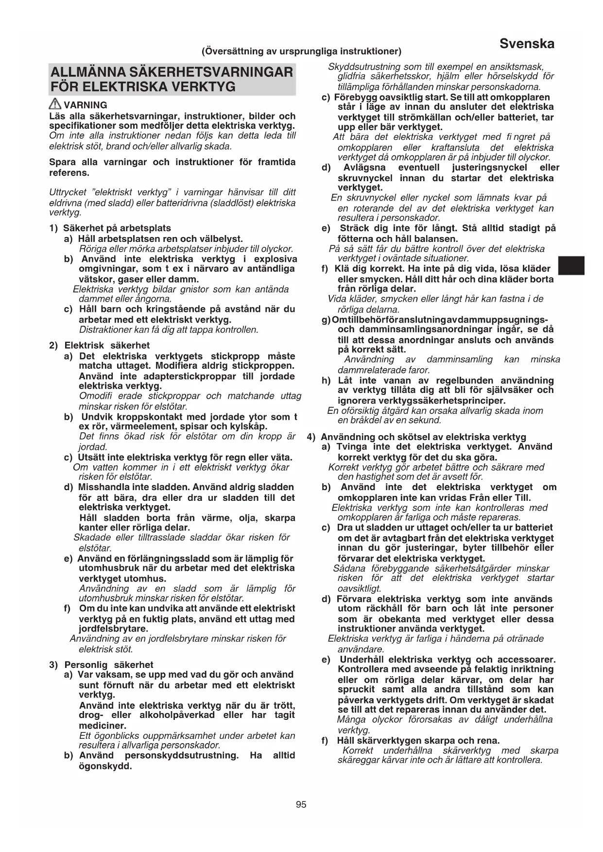 VARNING Läs alla säkerhetsvarningar, instruktioner, bilder och specifi kationer som medföljer detta elektriska verktyg. Om inte alla instruktioner nedan följs kan detta leda till elektrisk stöt, brand och/eller allvarlig skada. Spara alla varningar och instruktioner för framtida referens. Uttrycket ”elektriskt verktyg” i varningar hänvisar till ditt eldrivna (med sladd) eller batteridrivna (sladdlöst) elektriska verktyg.