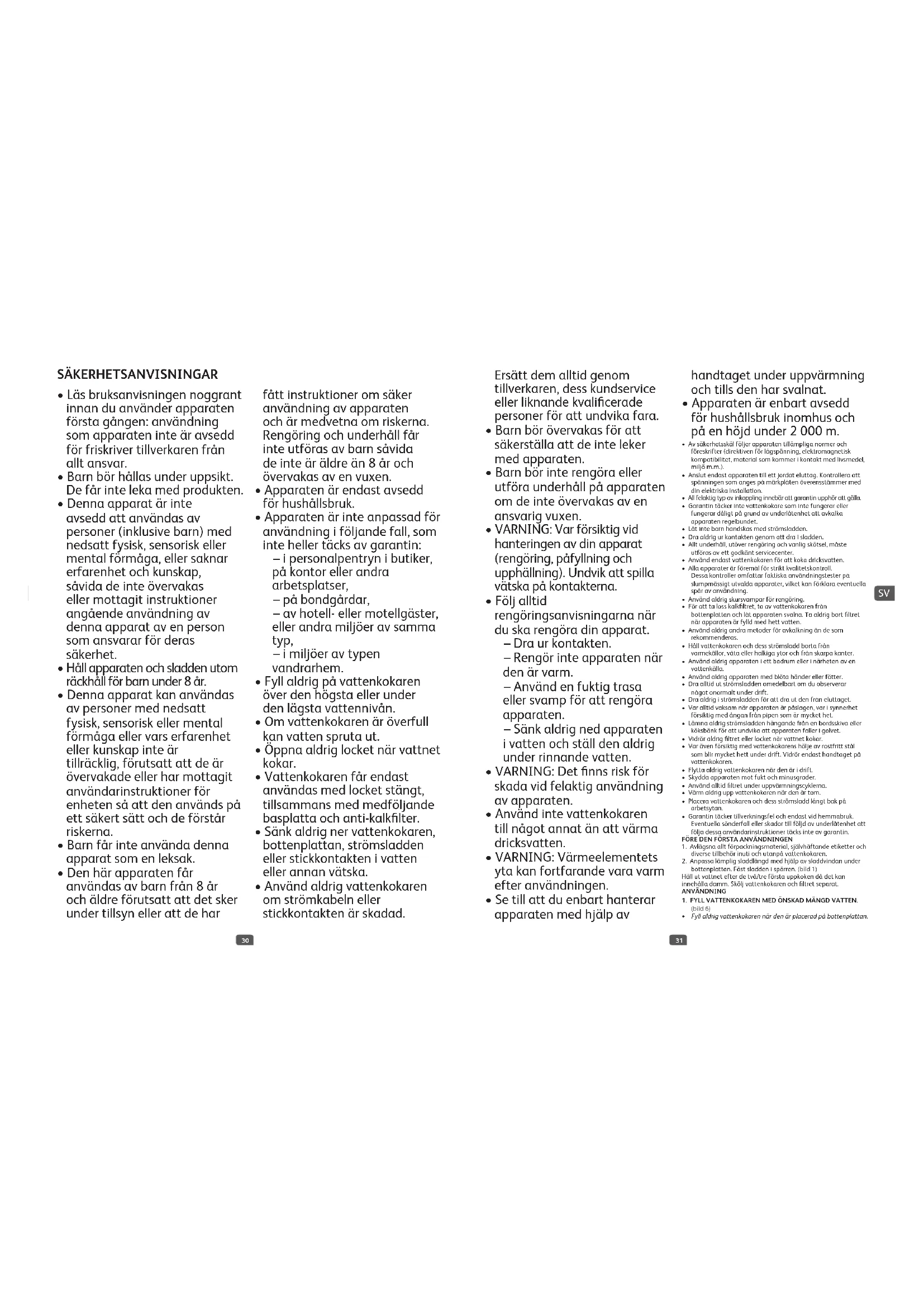 - Använd inte vattenkokaren till något annat än att värma dricksvatten.