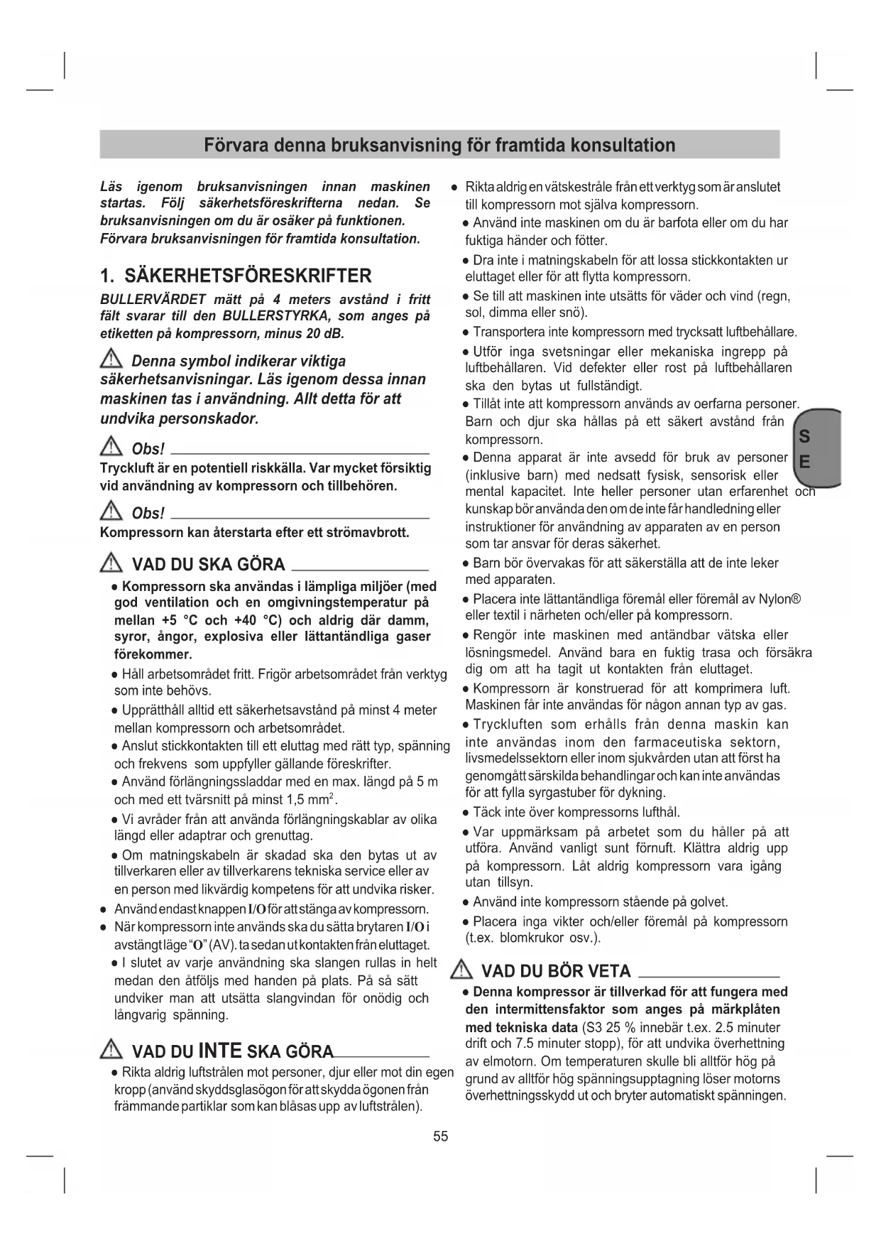 BULLERVÄRDET mätt på 4 meters avstånd i fritt fält svarar till den BULLERSTYRKA, som anges på etiketten på kompressorn, minus 20 dB. Denna symbol indikerar viktiga säkerhetsanvisningar. Läs igenom dessa innan maskinen tas i användning. Allt detta för att undvika personskador. Obs! Tryckluft är en potentiell riskkälla. Var mycket försiktig vid användning av kompressorn och tillbehören. Obs! Kompressorn kan återstarta efter ett strömavbrott.