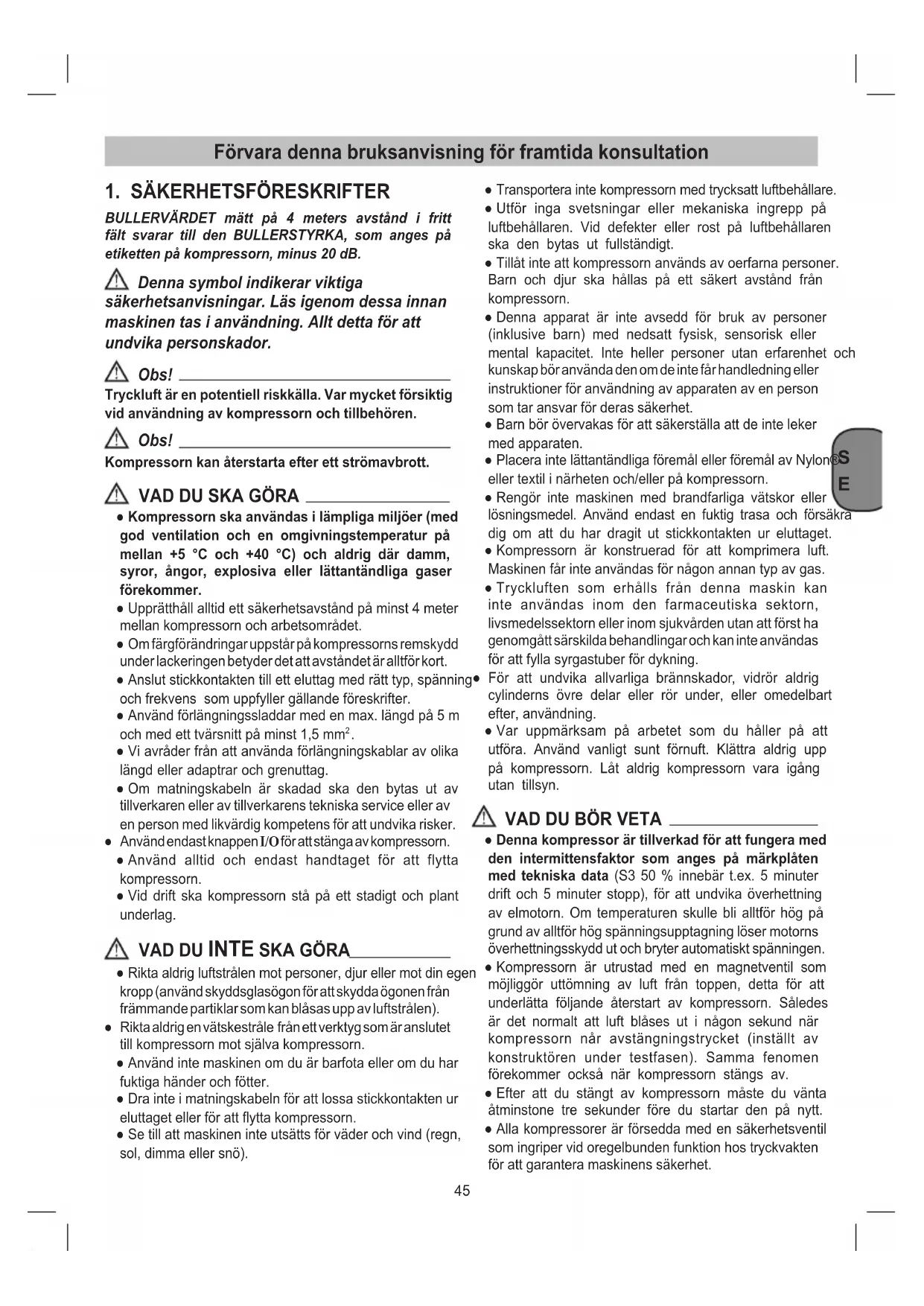BULLERVÄRDET mätt på 4 meters avstånd i fritt fält svarar till den BULLERSTYRKA, som anges på etiketten på kompressorn, minus 20 dB. Denna symbol indikerar viktiga säkerhetsanvisningar. Läs igenom dessa innan maskinen tas i användning. Allt detta för att undvika personskador. Obs! Tryckluft är en potentiell riskkälla. Var mycket försiktig vid användning av kompressorn och tillbehören. Obs! Kompressorn kan återstarta efter ett strömavbrott.