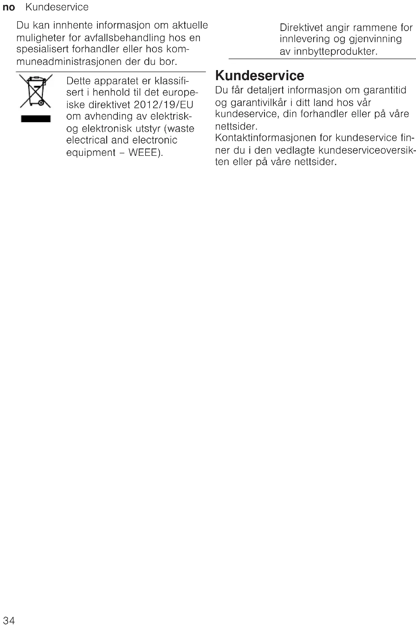 Denna enhet är märkt i en- lighet med der europeiska direktivet 2012/19/EU om avfall som utgörs av eller in- nehåller elektroniska produk- ter (waste electrical and e- lectronic equipment - WEEE). Direktivet anger ramarna för inom EU giltigt återtagande och korrekt återvinning av uttjänta enheter. Kundtjänst Utförligare information om garantitid och garantivillkor i ditt land finns hos service, återförsäljare eller på vår webbsajt. Kontaktuppgifterna till kundtjänsten finns i den medföljande kundtjänstförteckningen eller på vår webbplats.Turvallisuus fi