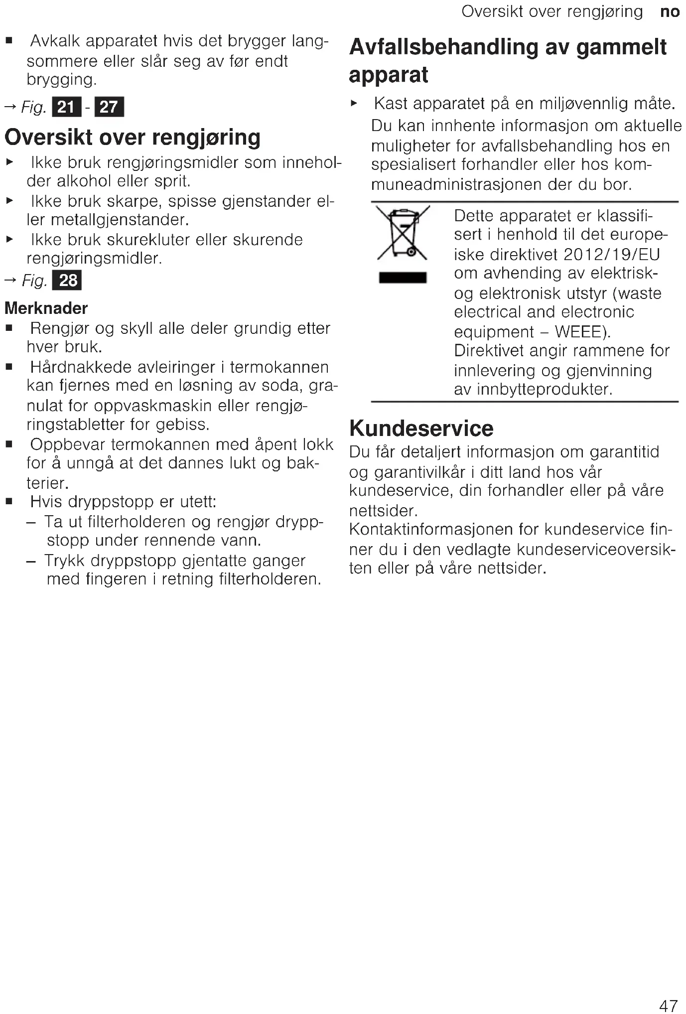 - Fig. 28 Anmärkningar ¡ Rengör och skölj alla delar noggrant ef- ter varje användning. ¡ Ta bort besvärliga avlagringar i ter- moskannan med en lösning av soda, maskindiskgranulat eller rengöringsme- del för löständer. ¡ För att förhindra dålig lukt och bakterie- bildning bör du förvara termoskannan med locket öppet. ¡ Om droppstoppet blir otätt: – Ta ut filterhållaren och rengör dropp- stoppet under rinnande vatten. – Tryck droppstoppet flera gånger med ett finger i riktning mot filterhållaren. Omhändertagande av begagna- de apparater ▶ Omhänderta enheten miljövänligt. Information om aktuell avfallshantering kan du få hos återförsäljare och kom- mun. Denna enhet är märkt i en- lighet med der europeiska direktivet 2012/19/EU om avfall som utgörs av eller in- nehåller elektroniska produk- ter (waste electrical and e- lectronic equipment - WEEE). Direktivet anger ramarna för inom EU giltigt återtagande och korrekt återvinning av uttjänta enheter. Kundtjänst Utförligare information om garantitid och garantivillkor i ditt land finns hos service, återförsäljare eller på vår webbsajt. Kontaktuppgifterna till kundtjänsten finns i den medföljande kundtjänstförteckningen eller på vår webbplats.Turvallisuus fi