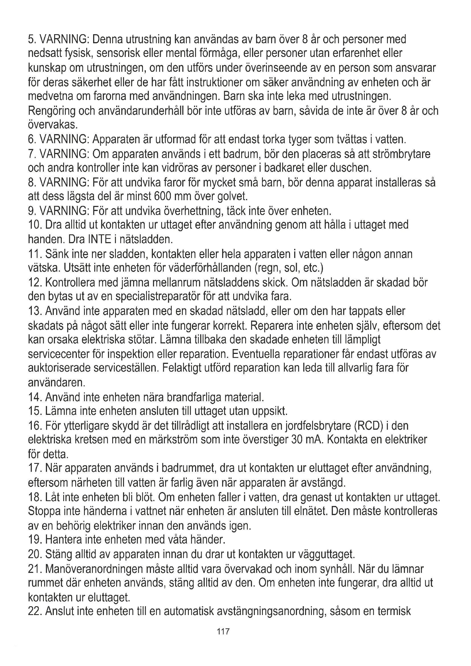 17. När apparaten används i badrummet, dra ut kontakten ur eluttaget efter användning,