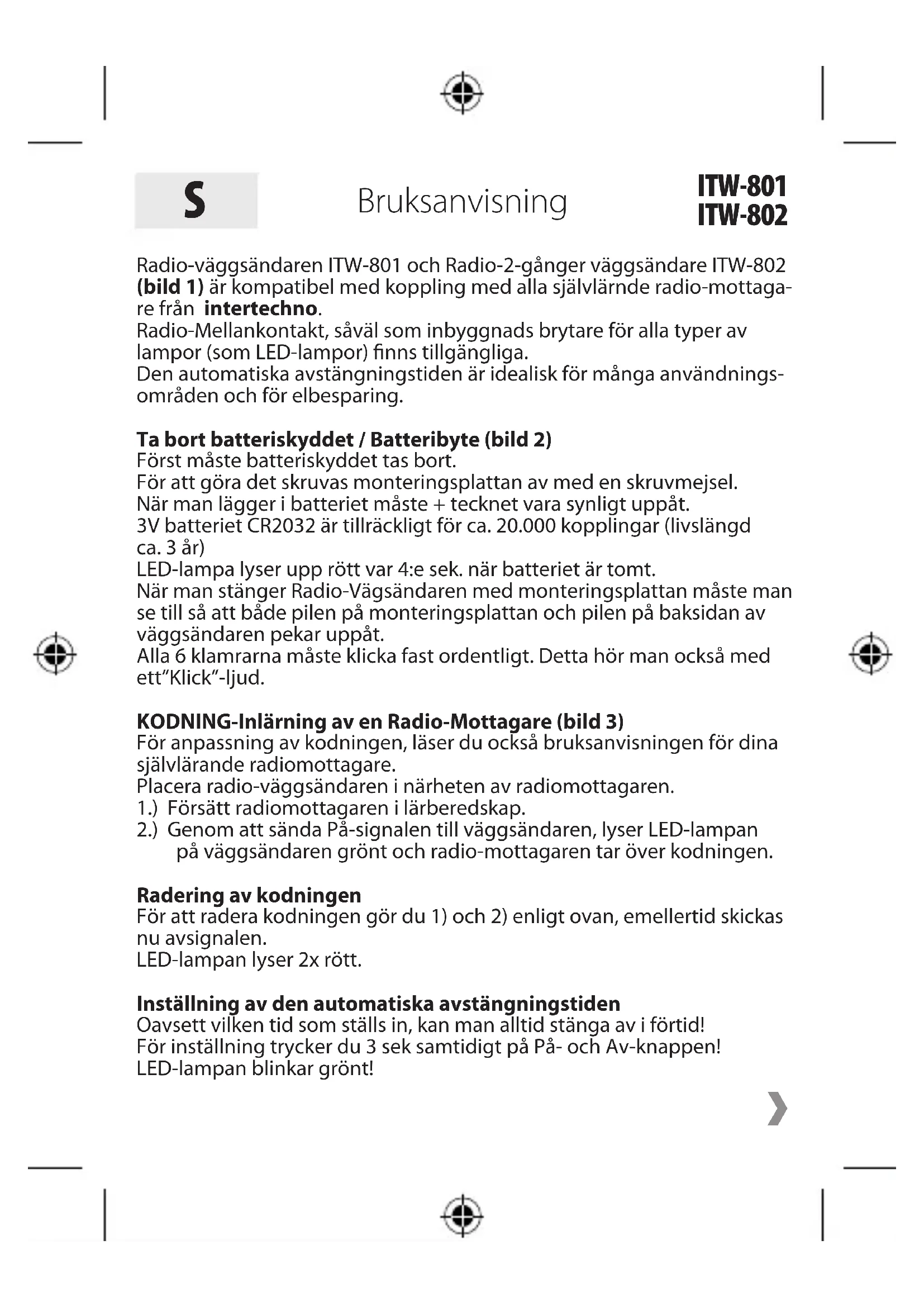 ITW-801 ITW-802Radio-väggsändaren ITW-801 och Radio-2-gånger väggsändare ITW-802 (bild 1) är kompatibel med koppling med alla självlärnde radio-mottaga- re från intertechno. Radio-Mellankontakt, såväl som inbyggnads brytare för alla typer av lampor (som LED-lampor) finns tillgängliga. Den automatiska avstängningstiden är idealisk för många användnings- områden och för elbesparing. Ta bort batteriskyddet / Batteribyte (bild 2) Först måste batteriskyddet tas bort. För att göra det skruvas monteringsplattan av med en skruvmejsel. När man lägger i batteriet måste + tecknet vara synligt uppåt. 3V batteriet CR2032 är tillräckligt för ca. 20.000 kopplingar (livslängd ca. 3 år) LED-lampa lyser upp rött var 4:e sek. när batteriet är tomt. När man stänger Radio-Vägsändaren med monteringsplattan måste man se till så att både pilen på monteringsplattan och pilen på baksidan av väggsändaren pekar uppåt. Alla 6 klamrarna måste klicka fast ordentligt. Detta hör man också med ett”Klick”-ljud. KODNING-Inlärning av en Radio-Mottagare (bild 3) För anpassning av kodningen, läser du också bruksanvisningen för dina självlärande radiomottagare. Placera radio-väggsändaren i närheten av radiomottagaren. 1.) Försätt radiomottagaren i lärberedskap. 2.) Genom att sända På-signalen till väggsändaren, lyser LED-lampan på väggsändaren grönt och radio-mottagaren tar över kodningen. Radering av kodningen För att radera kodningen gör du 1) och 2) enligt ovan, emellertid skickas nu avsignalen. LED-lampan lyser 2x rött. Inställning av den automatiska avstängningstiden Oavsett vilken tid som ställs in, kan man alltid stänga av i förtid! För inställning trycker du 3 sek samtidigt på På- och Av-knappen! LED-lampan blinkar grönt!