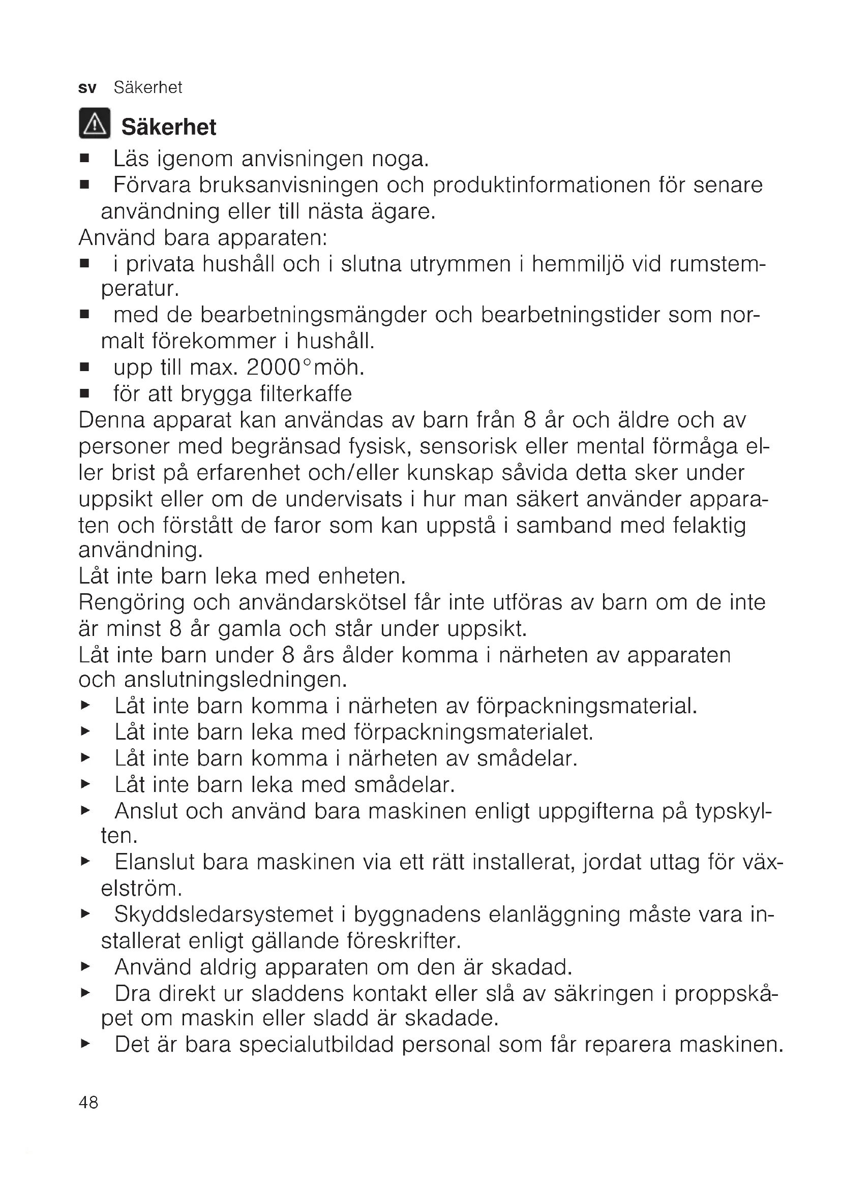 Säkerhet ¡ Läs igenom anvisningen noga. ¡ Förvara bruksanvisningen och produktinformationen för senare användning eller till nästa ägare. Använd bara apparaten: ¡ i privata hushåll och i slutna utrymmen i hemmiljö vid rumstem- peratur. ¡ med de bearbetningsmängder och bearbetningstider som nor- malt förekommer i hushåll. ¡ upp till max. 2000°möh. ¡ för att brygga filterkaffe Denna apparat kan användas av barn från 8år och äldre och av personer med begränsad fysisk, sensorisk eller mental förmåga el- ler brist på erfarenhet och/eller kunskap såvida detta sker under uppsikt eller om de undervisats i hur man säkert använder appara- ten och förstått de faror som kan uppstå i samband med felaktig användning. Låt inte barn leka med enheten. Rengöring och användarskötsel får inte utföras av barn om de inte är minst 8år gamla och står under uppsikt. Låt inte barn under 8års ålder komma i närheten av apparaten och anslutningsledningen. ▶ Låt inte barn komma i närheten av förpackningsmaterial. ▶ Låt inte barn leka med förpackningsmaterialet. ▶ Låt inte barn komma i närheten av smådelar. ▶ Låt inte barn leka med smådelar. ▶ Anslut och använd bara maskinen enligt uppgifterna på typskyl- ten. ▶ Elanslut bara maskinen via ett rätt installerat, jordat uttag för väx- elström. ▶ Skyddsledarsystemet i byggnadens elanläggning måste vara in- stallerat enligt gällande föreskrifter. ▶ Använd aldrig apparaten om den är skadad. ▶ Dra direkt ur sladdens kontakt eller slå av säkringen i proppskå- pet om maskin eller sladd är skadade. ▶ Det är bara specialutbildad personal som får reparera maskinen.Förhindrande av sakskador sv