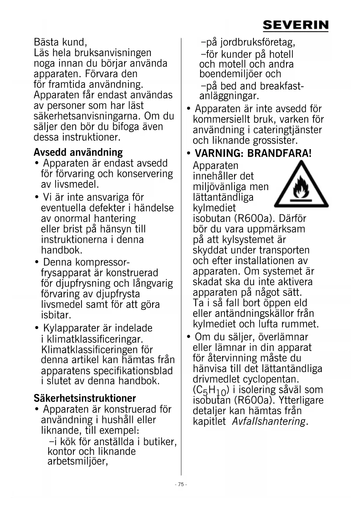 - VARNING: BRANDFARA! Apparaten innehåller det miljövänliga men lättantändliga kylmediet isobutan (R600a). Därför bör du vara uppmärksam på att kylsystemet är skyddat under transporten och efter installationen av apparaten. Om systemet är skadat ska du inte aktivera apparaten på något sätt. Ta i så fall bort öppen eld eller antändningskällor från kylmediet och lufta rummet.