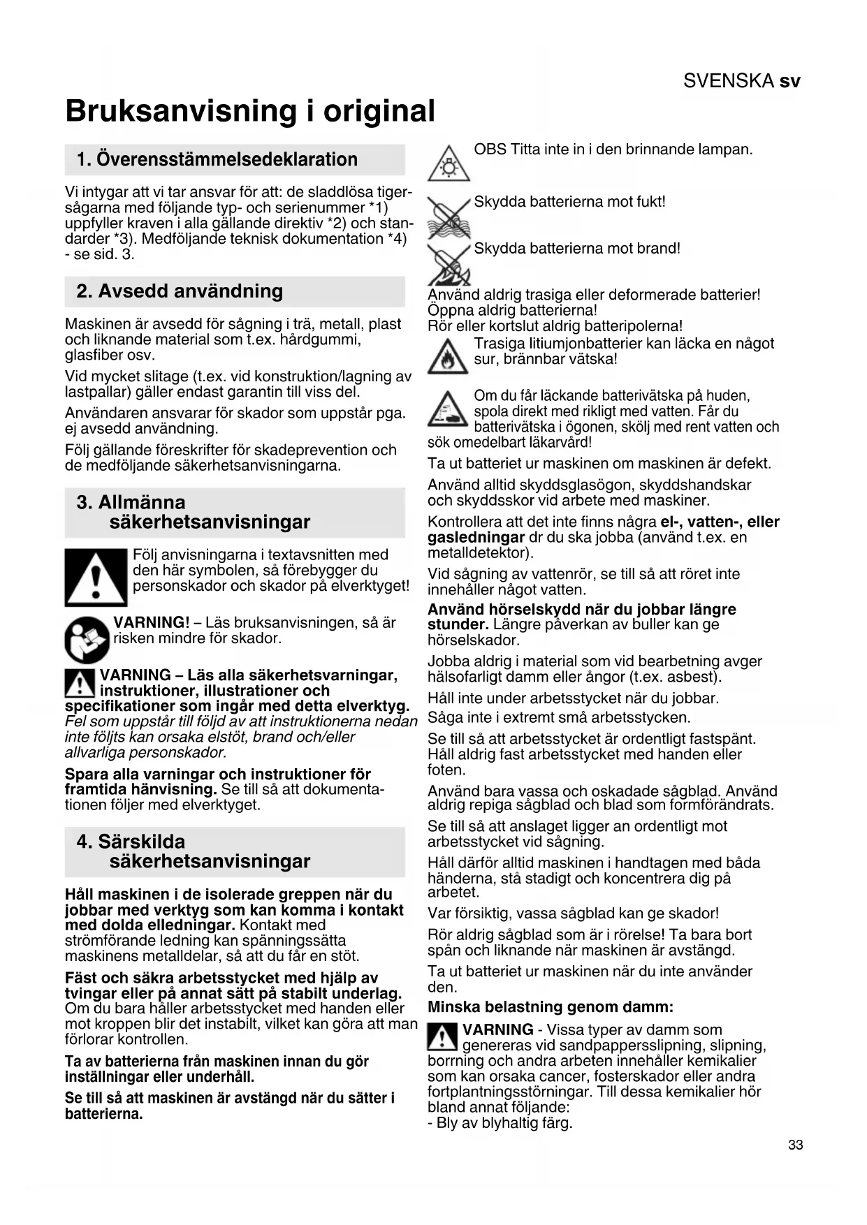 Bruksanvisning i original Vi intygar att vi tar ansvar för att: de sladdlösa tiger- sågarna med följande typ- och serienummer *1) uppfyller kraven i alla gällande direktiv *2) och stan- darder *3). Medföljande teknisk dokumentation *4) - se sid. 3. Maskinen är avsedd för sågning i trä, metall, plast och liknande material som t.ex. hårdgummi, glasfiber osv. Vid mycket slitage (t.ex. vid konstruktion/lagning av lastpallar) gäller endast garantin till viss del. Användaren ansvarar för skador som uppstår pga. ej avsedd användning. Följ gällande föreskrifter för skadeprevention och de medföljande säkerhetsanvisningarna. Följ anvisningarna i textavsnitten med den här symbolen, så förebygger du personskador och skador på elverktyget! VARNING! – Läs bruksanvisningen, så är risken mindre för skador. VARNING – Läs alla säkerhetsvarningar, instruktioner, illustrationer och specifikationer som ingår med detta elverktyg. Fel som uppstår till följd av att instruktionerna nedan inte följts kan orsaka elstöt, brand och/eller allvarliga personskador. Spara alla varningar och instruktioner för framtida hänvisning. Se till så att dokumenta- tionen följer med elverktyget. Håll maskinen i de isolerade greppen när du jobbar med verktyg som kan komma i kontakt med dolda elledningar. Kontakt med strömförande ledning kan spänningssätta maskinens metalldelar, så att du får en stöt. Fäst och säkra arbetsstycket med hjälp av tvingar eller på annat sätt på stabilt underlag. Om du bara håller arbetsstycket med handen eller mot kroppen blir det instabilt, vilket kan göra att man förlorar kontrollen. Ta av batterierna från maskinen innan du gör inställningar eller underhåll. Se till så att maskinen är avstängd när du sätter i batterierna. OBS Titta inte in i den brinnande lampan. Skydda batterierna mot fukt! Skydda batterierna mot brand! Använd aldrig trasiga eller deformerade batterier! Öppna aldrig batterierna! Rör eller kortslut aldrig batteripolerna! Trasiga litiumjonbatterier kan läcka en något sur, brännbar vätska! Om du får läckande batterivätska på huden, spola direkt med rikligt med vatten. Får du batterivätska i ögonen, skölj med rent vatten och sök omedelbart läkarvård! Ta ut batteriet ur maskinen om maskinen är defekt. Använd alltid skyddsglasögon, skyddshandskar och skyddsskor vid arbete med maskiner. Kontrollera att det inte finns några el-, vatten-, eller gasledningar dr du ska jobba (använd t.ex. en metalldetektor). Vid sågning av vattenrör, se till så att röret inte innehåller något vatten. Använd hörselskydd när du jobbar längre stunder. Längre påverkan av buller kan ge hörselskador. Jobba aldrig i material som vid bearbetning avger hälsofarligt damm eller ångor (t.ex. asbest). Håll inte under arbetsstycket när du jobbar. Såga inte i extremt små arbetsstycken. Se till så att arbetsstycket är ordentligt fastspänt. Håll aldrig fast arbetsstycket med handen eller foten. Använd bara vassa och oskadade sågblad. Använd aldrig repiga sågblad och blad som formförändrats. Se till så att anslaget ligger an ordentligt mot arbetsstycket vid sågning. Håll därför alltid maskinen i handtagen med båda händerna, stå stadigt och koncentrera dig på arbetet. Var försiktig, vassa sågblad kan ge skador! Rör aldrig sågblad som är i rörelse! Ta bara bort spån och liknande när maskinen är avstängd. Ta ut batteriet ur maskinen när du inte använder den. Minska belastning genom damm: VARNING - Vissa typer av damm som genereras vid sandpappersslipning, slipning, borrning och andra arbeten innehåller kemikalier som kan orsaka cancer, fosterskador eller andra fortplantningsstörningar. Till dessa kemikalier hör bland annat följande: - Bly av blyhaltig färg.