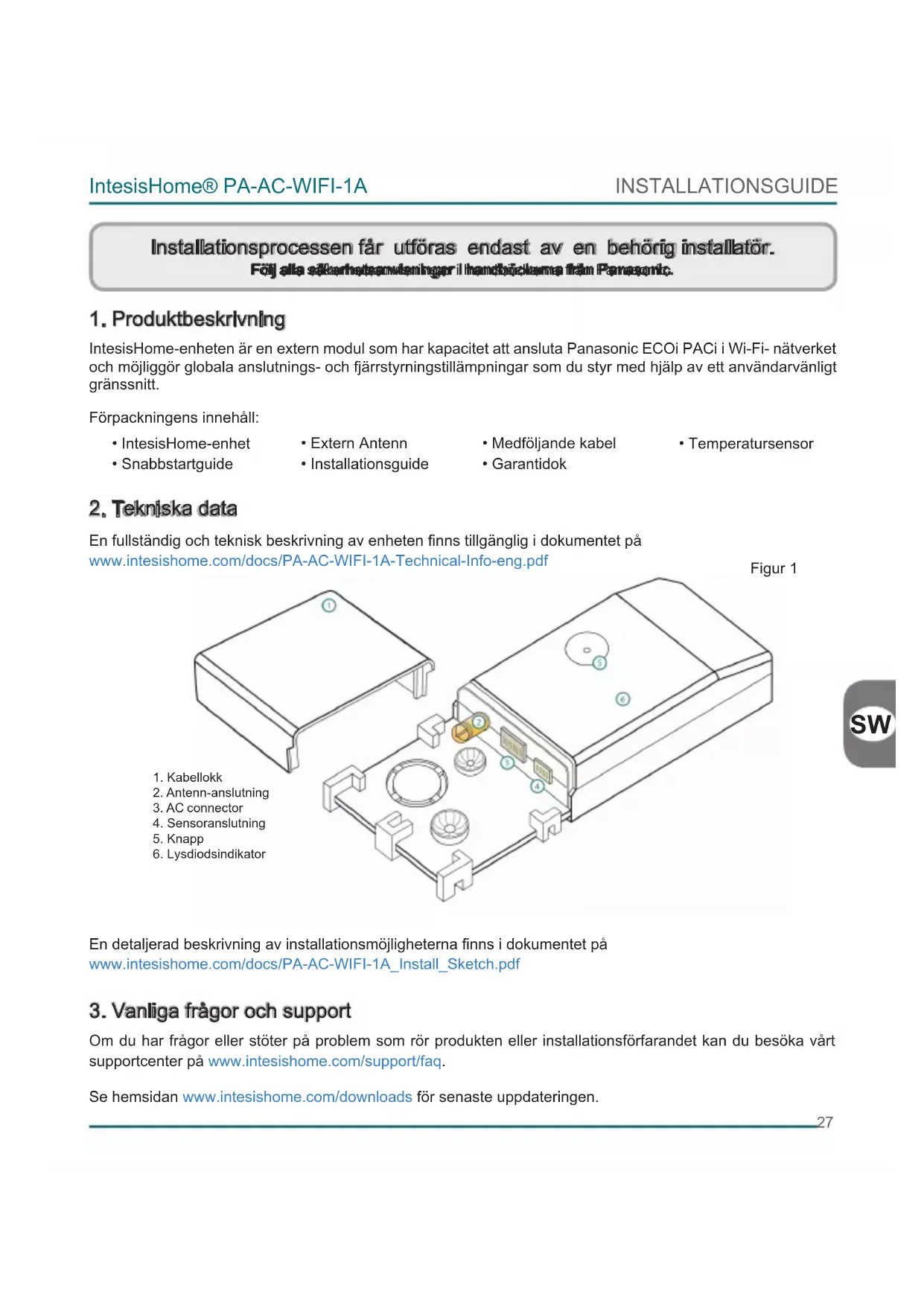IntesisHome-enheten är en extern modul som har kapacitet att ansluta Panasonic ECOi PACi i Wi-Fi- nätverket och möjliggör globala anslutnings- och fjärrstyrningstillämpningar som du styr med hjälp av ett användarvänligt gränssnitt. Förpackningens innehåll: En fullständig och teknisk beskrivning av enheten nns tillgänglig i dokumentet på www.intesishome.com/docs/PA-AC-WIFI-1A-Technical-Info-eng.pdf En detaljerad beskrivning av installationsmöjligheterna nns i dokumentet på www.intesishome.com/docs/PA-AC-WIFI-1A_Install_Sketch.pdf Om du har frågor eller stöter på problem som rör produkten eller installationsförfarandet kan du besöka vårt supportcenter på www.intesishome.com/support/faq. Se hemsidan www.intesishome.com/downloads för senaste uppdateringen. Installationsprocessen får utföras endast av en behörig installatör. Följ alla säkerhetsanvisningar i handböckerna från Panasonic.