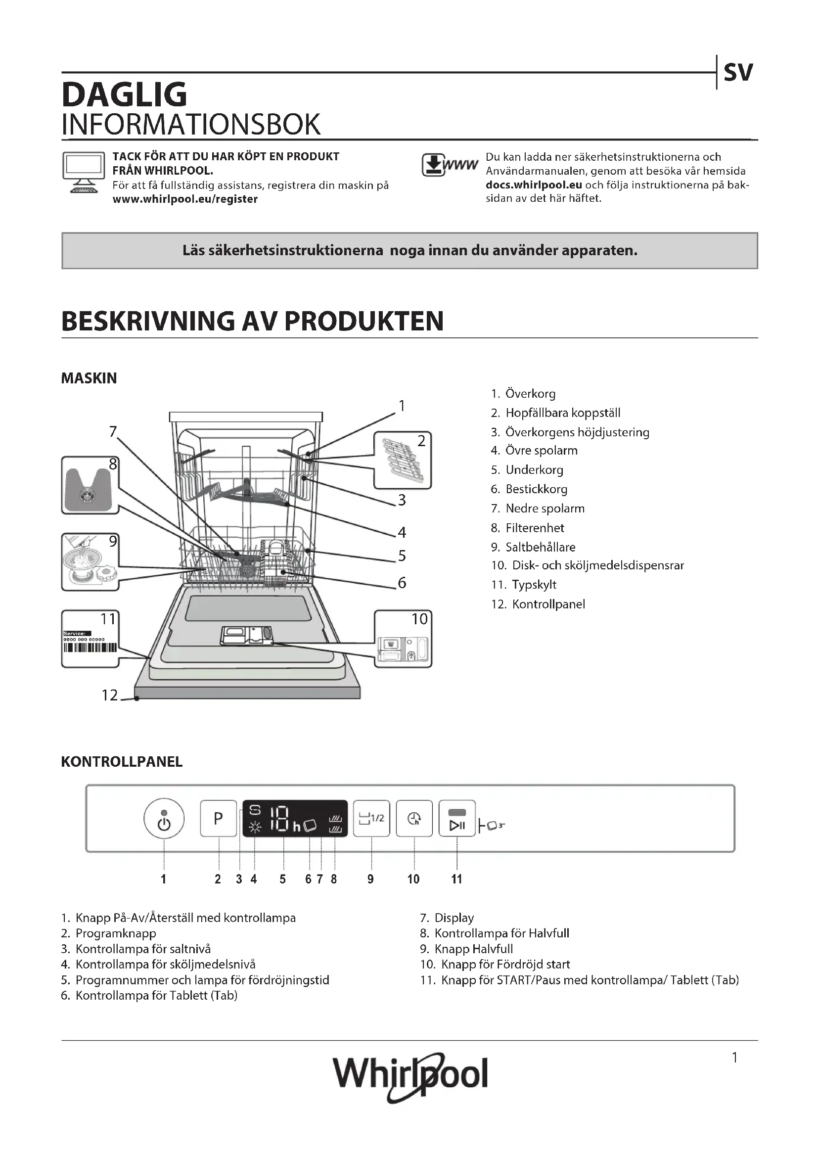 KONTROLLPANEL1. Överkorg2. Hopfällbara koppställ3. Överkorgens höjdjustering4. Övre spolarm5. Underkorg6. Bestickkorg7. Nedre spolarm8. Filterenhet9. Saltbehållare10. Disk- och sköljmedelsdispensrar11. Typskylt12. KontrollpanelDu kan ladda ner säkerhetsinstruktionerna och Användarmanualen, genom att besöka vår hemsida docs.whirlpool.eu och följa instruktionerna på bak-sidan av det här häftet. 0000 000 00000 Service: