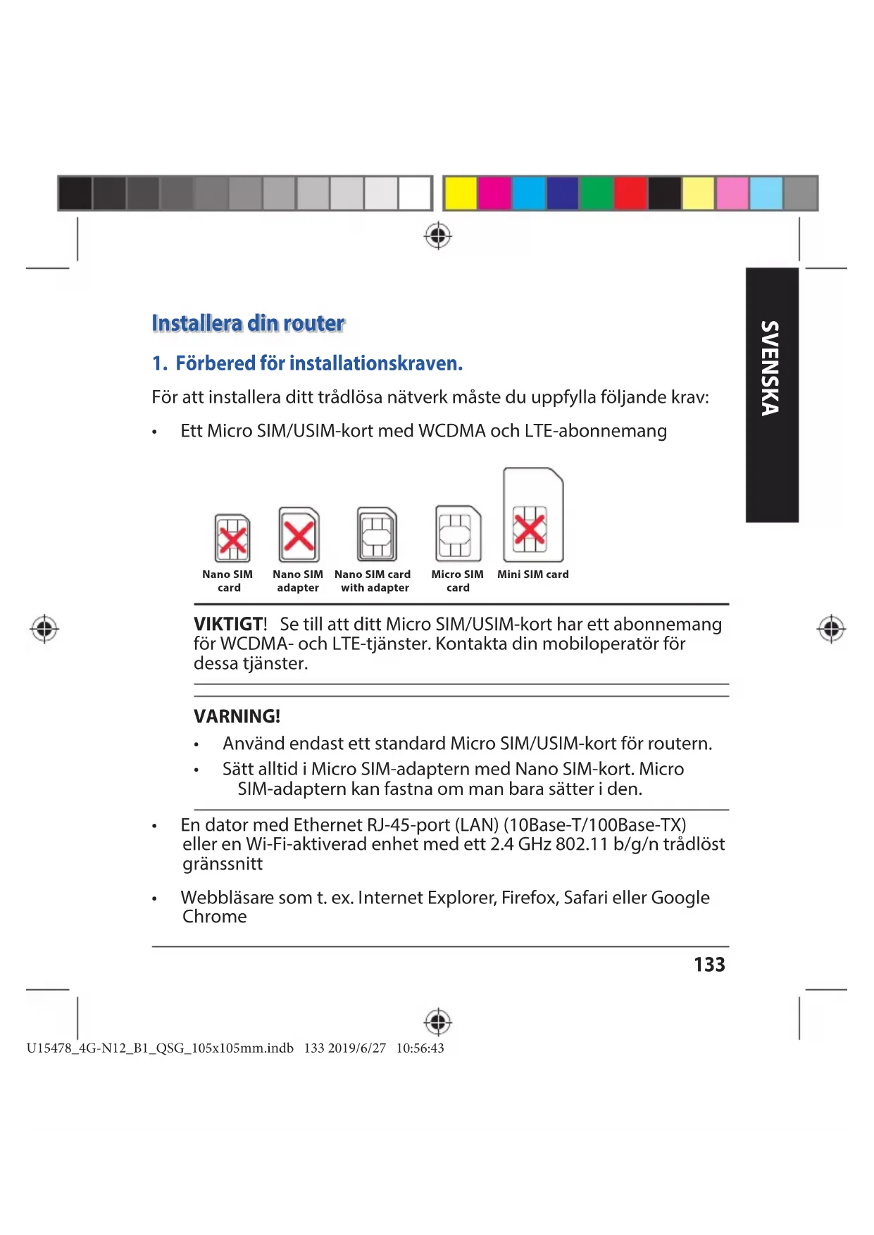 för WCDMA- och LTE-tjänster. Kontakta din mobiloperatör för dessa tjänster. VARNING! t "OWÊOEFOEBTUFUUTUBOEBSE.JDSP4*.64*.LPSUGÚSSPVUFSO t Sätt alltid i Micro SIM-adaptern med Nano SIM-kort. Micro SIM-adaptern kan fastna om man bara sätter i den. t &OEBUPSNFE&UIFSOFU3+QPSU-"/#BTF5#BTF59 eller en Wi-Fi-aktiverad enhet med ett 2.4 GHz 802.11 b/g/n trådlöst gränssnitt t 8FCCMÊTBSFTPNUFY*OUFSOFU&YQMPSFS'JSFGPY4BGBSJFMMFS(PPHMF Chrome Mini SIM card Micro SIM card Nano SIM card Nano SIM adapter Nano SIM card with adapter U15478_4G-N12_B1_QSG_105x105mm.indb 133 2019/6/27 10:56:43SVENSKA