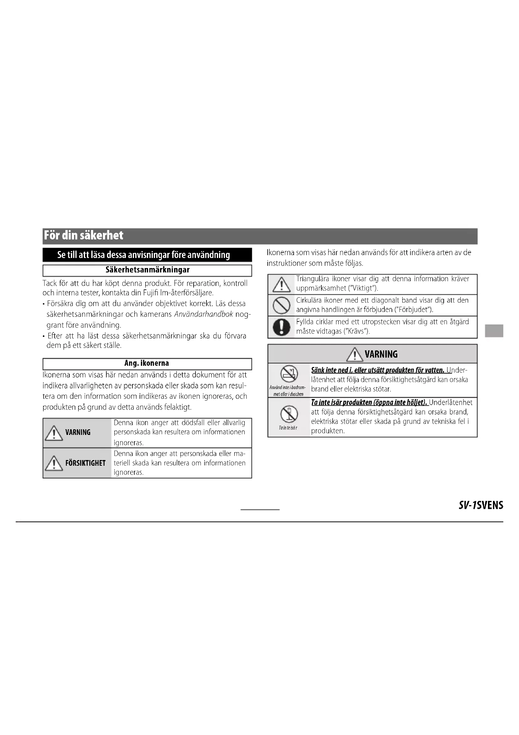 - Efter att ha läst dessa säkerhetsanmärkningar ska du förvara dem på ett säkert ställe. Ang. ikonerna Ikonerna som visas här nedan används i detta dokument för att indikera allvarligheten av personskada eller skada som kan resul- tera om den information som indikeras av ikonen ignoreras, och produkten på grund av detta används felaktigt. VARNINGDenna ikon anger att dödsfall eller allvarlig personskada kan resultera om informationen ignoreras.FÖRSIKTIGHETDenna ikon anger att personskada eller ma-teriell skada kan resultera om informationen ignoreras. Ikonerna som visas här nedan används för att indikera arten av de instruktioner som måste följas. Triangulära ikoner visar dig att denna information kräver uppmärksamhet (”Viktigt”).Cirkulära ikoner med ett diagonalt band visar dig att den angivna handlingen är förbjuden (”Förbjudet”).Fyllda cirklar med ett utropstecken visar dig att en åtgärd måste vidtagas (”Krävs”).