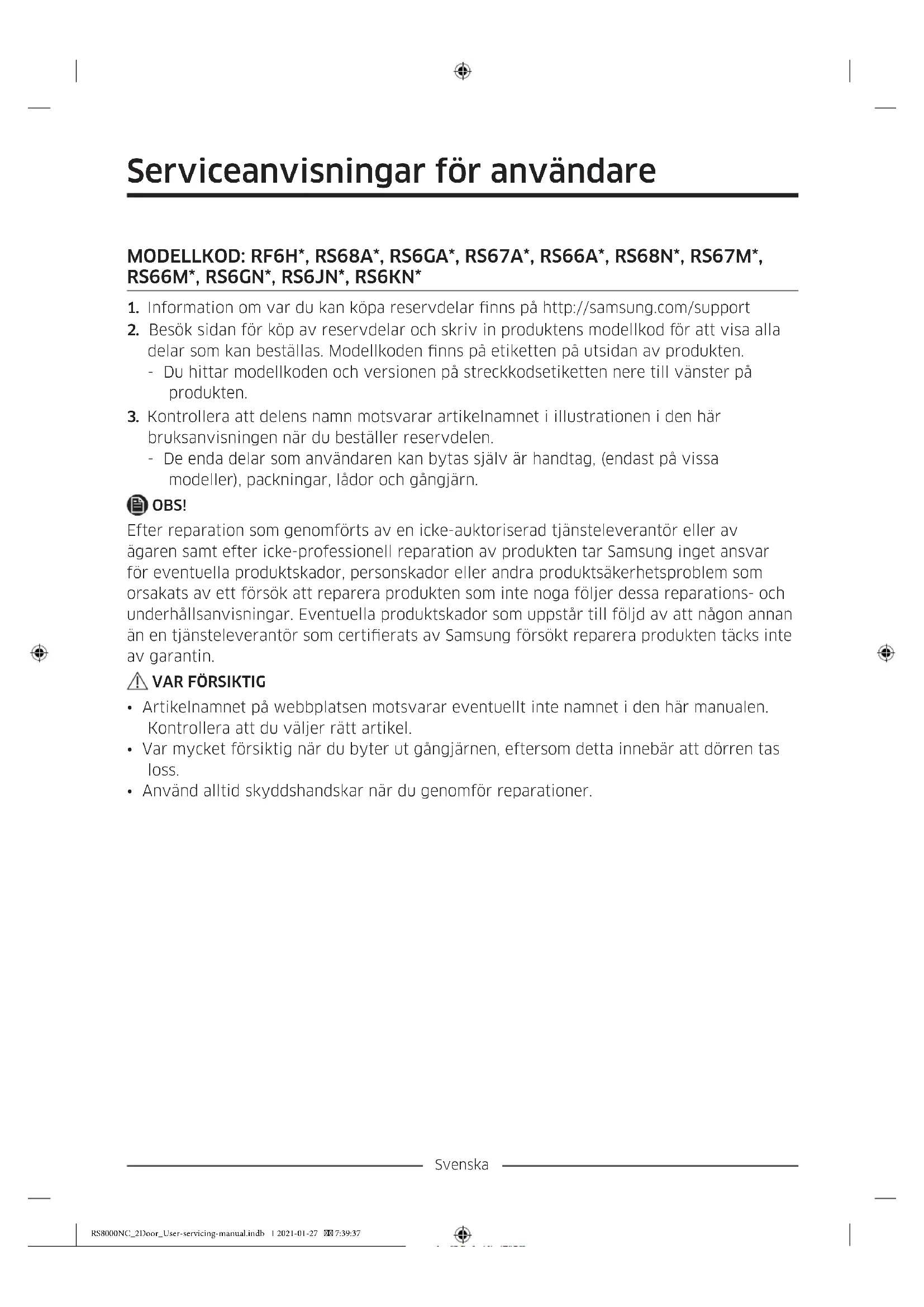 - Använd alltid skyddshandskar när du genomför reparationer. RS8000NC_2Door_User-servicing-manual.indb 1 2021-01-27 7:39:37Svenska Det faktiska utseendet och medföljande delar till kylskåpet kan skilja sig åt beroende på modell och land.