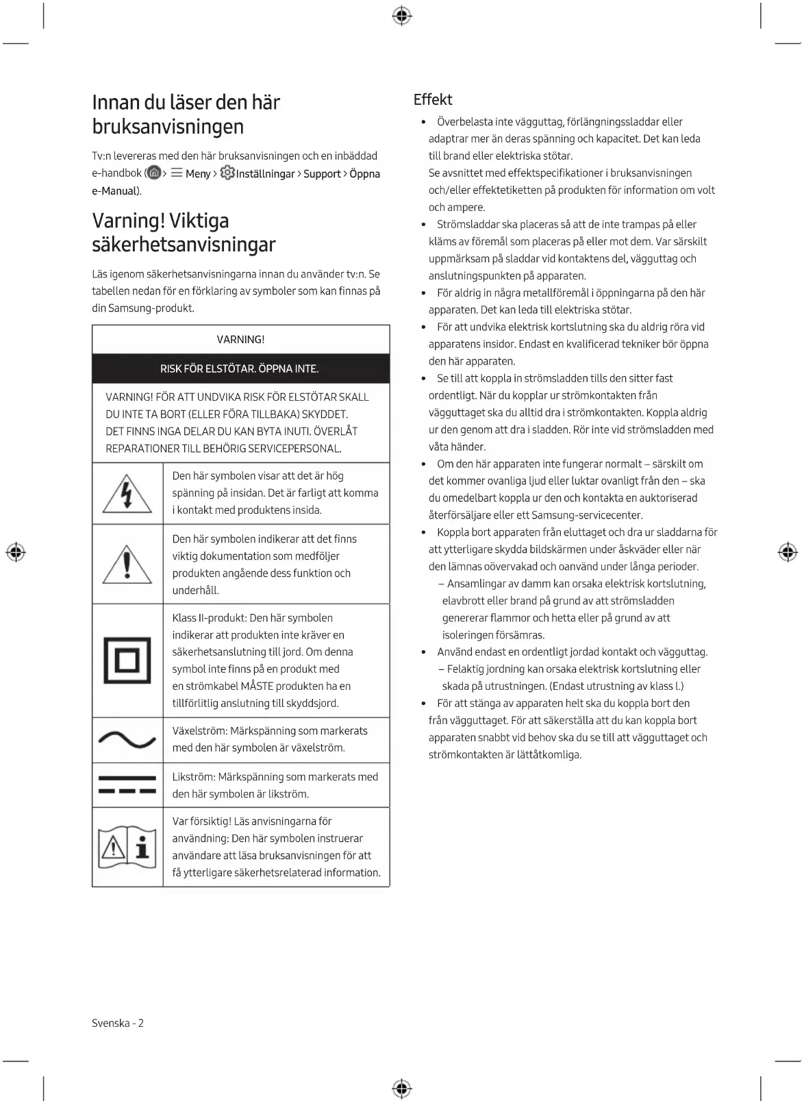 - Der Batterietyp ist modellabhängig. Deutsch - 9 DeutschInnan du läser den här bruksanvisningen Tv:n levereras med den här bruksanvisningen och en inbäddad e-handbok ( > Meny > Inställningar > Support > Öppna e-Manual). Varning! Viktiga säkerhetsanvisningar Läs igenom säkerhetsanvisningarna innan du använder tv:n. Se tabellen nedan för en förklaring av symboler som kan finnas på din Samsung-produkt. VARNING! RISK FÖR ELSTÖTAR. ÖPPNA INTE. VARNING! FÖR ATT UNDVIKA RISK FÖR ELSTÖTAR SKALL DU INTE TA BORT (ELLER FÖRA TILLBAKA) SKYDDET. DET FINNS INGA DELAR DU KAN BYTA INUTI. ÖVERLÅT REPARATIONER TILL BEHÖRIG SERVICEPERSONAL. Den här symbolen visar att det är hög spänning på insidan. Det är farligt att komma i kontakt med produktens insida. Den här symbolen indikerar att det finns viktig dokumentation som medföljer produkten angående dess funktion och underhåll. Klass II-produkt: Den här symbolen indikerar att produkten inte kräver en säkerhetsanslutning till jord. Om denna symbol inte finns på en produkt med en strömkabel MÅSTE produkten ha en tillförlitlig anslutning till skyddsjord. Växelström: Märkspänning som markerats med den här symbolen är växelström. Likström: Märkspänning som markerats med den här symbolen är likström. Var försiktig! Läs anvisningarna för användning: Den här symbolen instruerar användare att läsa bruksanvisningen för att få ytterligare säkerhetsrelaterad information. Effekt