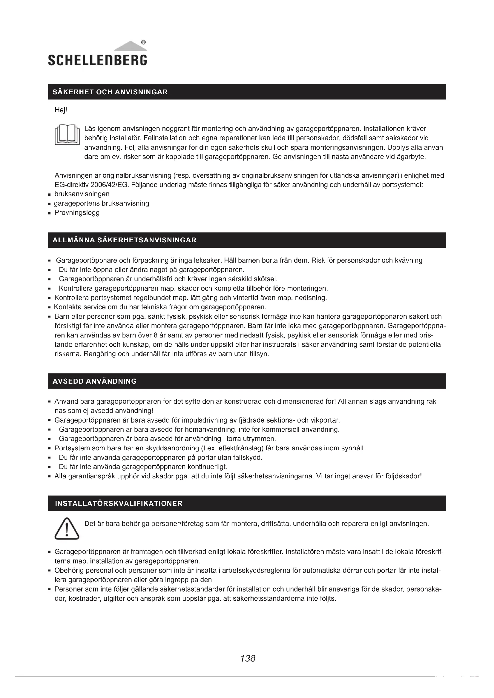 Använd bara garageportöppnaren för det syfte den är konstruerad och dimensionerad för! All annan slags användning räk- nas som ej avsedd användning! Garageportöppnaren är bara avsedd för impulsdrivning av fjädrade sektions- och vikportar. Garageportöppnaren är bara avsedd för hemanvändning, inte för kommersiell användning. Garageportöppnaren är bara avsedd för användning i torra utrymmen. Portsystem som bara har en skyddsanordning (t.ex. eektfrånslag) får bara användas inom synhåll. Du får inte använda garageportöppnaren på portar utan fallskydd. Du får inte använda garageportöppnaren kontinuerligt. Alla garantianspråk upphör vid skador pga. att du inte följt säkerhetsanvisningarna. Vi tar inget ansvar för följdskador! INSTALLATÖRSKVALIFIKATIONER Det är bara behöriga personer/företag som får montera, driftsätta, underhålla och reparera enligt anvisningen. Garageportöppnaren är framtagen och tillverkad enligt lokala föreskrifter. Installatören måste vara insatt i de lokala föreskrif- terna map. installation av garageportöppnaren. Obehörig personal och personer som inte är insatta i arbetsskyddsreglerna för automatiska dörrar och portar får inte instal- lera garageportöppnaren eller göra ingrepp på den. Personer som inte följer gällande säkerhetsstandarder för installation och underhåll blir ansvariga för de skador, personska- dor, kostnader, utgifter och anspråk som uppstår pga. att säkerhetsstandarderna inte följts.139