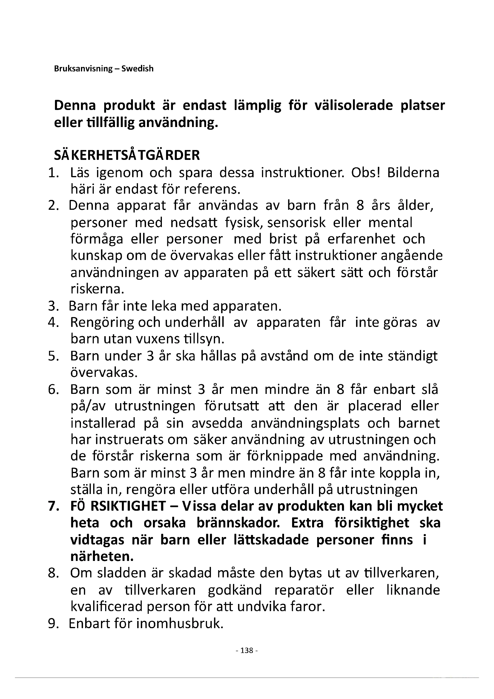 Uppfyller kraven i EU-rådets direktiv: KOMMISSIONENS FÖ RORDNING (EU) nr. 2015/1188 från 28 april 2015 och ändring av KOMMISSIONENS FÖ RORDNING (EU) 2016/2282 för genomförande av Europaparlamentets och rådets direktiv 2009/125/EG gällande krav på ekodesign för lokala rumsvärmare För information till kunden för hur man installerar, använder och underhåller produkten, WEEE-information, vänligen kontrollera bruksanvisningen som är inkluderad i förpackningen.- 145 - Kullanım talimatı – Turkish Bu ürün sadece iyi yalıtılmış yerler veya ara sıra kullanım için uygundur.