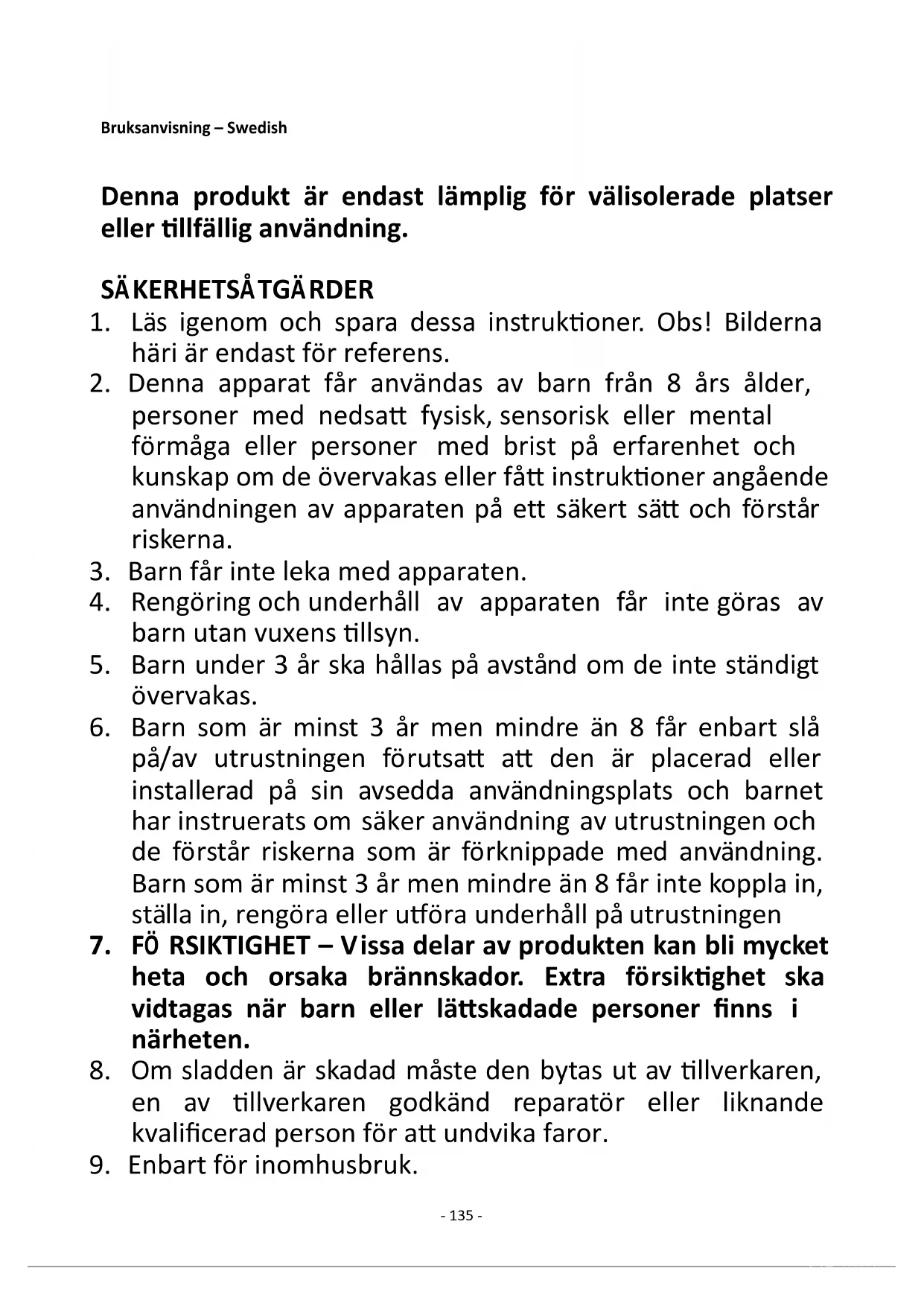 Rör aldrig vid produkten under drift och se till att inga barn kommer nära det, för att undvika brännskador. Låt produkten svalna helt när du har använt den färdigt, innan- 137 - du rör vid den eller lägger undan den för förvaring. Bryt alltid strömförsörjningen om du inte använder produkten under en längre tid.