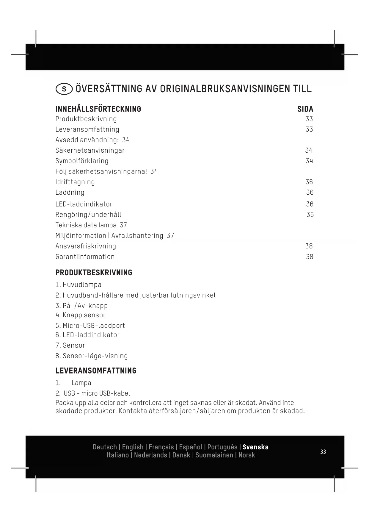 Packa upp alla delar och kontrollera att inget saknas eller är skadat. Använd inte skadade produkter. Kontakta återförsäljaren/säljaren om produkten är skadad. Produktbeskrivning 33 Leveransomfattning 33 Avsedd användning: 34 Säkerhetsanvisningar 34 Symbolförklaring 34 Följ säkerhetsanvisningarna! 34 Idrifttagning 36 Laddning 36 LED-laddindikator 36 Rengöring/underhåll 36 Tekniska data lampa 37 Miljöinformation | Avfallshantering 37 Ansvarsfriskrivning 38 Garantiinformation 38 Deutsch | English | Français | Español | Português | Svenska Italiano | Nederlands | Dansk | Suomalainen | Norsk Deutsch | English | Français | Español | Português | Svenska Italiano | Nederlands | Dansk | Suomalainen | Norsk34 AVSEDD ANVÄNDNING: § Produkten används som mobil pannlampa § Lampan får inte användas för andra ändamål § Ej lämpad som rumsbelysning i hemmet § Produkten är inte avsedd för kommersiellt bruk SÄKERHETSANVISNINGAR Den här bruksanvisningen innehåller viktigt information om användning och driftsättning av följande produkt: Sensor-pannlampa, nedan endast kallad lampa eller produkt. Läs noggrant igenom den här bruksanvisningen innan du börjar använda lampan och följ den. Spara bruksanvisningen för senare användning eller för efterföljande innehavare. Om bruksanvisningen och säkerhetsanvisningarna inte beaktas kan det leda till skador på produkten och risker (skador) för användaren och personer i närheten. Bruksanvisningen baseras på tillämpliga standarder och regler i EU. Beakta även landspecifika lagar och föreskrifter. SYMBOLFÖRKLARING Beakta följande symboler och signalord som finns i bruksanvisningen, på produk- ten och på förpackningen. Information Nyttig extrainformation om produkten Obs Denna anvisning varnar för alla typer skador Varning Se upp – fara! Om denna anvisning inte beaktas kan detta leda till svåra personskador eller dödsfall FÖLJ SÄKERHETSANVISNINGARNA! Undvik ögonskador - titta aldrig i ljusstrålen och lys aldrig andra personer i an- siktet. Om detta sker under längre tid kan andelen blått ljus skada näthinnan. Om ljusstrålen kommer in i ögat, ska du stänga ögonen och vända bort huvudet från ljusstrålen. Denna lampa överskrider villkoren för riskfri användning. Risken vid användning beror på hur användaren hanterar lampan. Deutsch | English | Français | Español | Português | Svenska Italiano | Nederlands | Dansk | Suomalainen | Norsk Deutsch | English | Français | Español | Português | Svenska Italiano | Nederlands | Dansk | Suomalainen | Norsk35 Riskvärde för exponering / Exposure Hazard Value (EHV) (1) : 8 Riskgrupp Fara avstånd / Hazard Distance (HD) (2) 2 0m – 0,47m 1 0,47m – 4,7m Fri Grupp > 4,7m (1) Detta värde anger den faktor, med vilken riskgruppgränsvärdet överskrids gentemot den näst lägsta gruppen. Gränsvärdet ligger vid 1. (2) Avståndet mellan ögonen och lampan, då den motsvarande riskgruppen gäller. § Öppna inte eller modifiera inte produkten! Reparationsarbeten samt batteribyte får endast utföras av tillverkaren eller av en auktoriserad servicetekniker eller en person med jämförbar kvalifikation. § Håll barn borta från produkten och förpackningen. Produkten är ingen leksak. Håll barn under uppsikt så att de inte leker med produkten. § Denna produkt är inte avsedd för användning av personer (inklusive barn) som har begränsade kroppsförmågor, sensoriska eller mentala förmågor eller inte har erfa- renhet och kunskap gällande hantering med denna produkt. Sådana personer måste först informeras av den tillsynsperson som har ansvaret för säkerhet och bevakas vid hantering med produkten! § LED-ljuskällan kan inte bytas. I slutet av LED-ljuskällans livslängd måste hela lampan bytas § Alla belysta föremål måste finnas på minst 10 cm avstånd från lampan! § Lampan får endast användas för avsedda ändamål. § Produkten är inte en leksak. § Förvara produkten utom barns räckhåll! § Om du inte följer säkerhetsanvisningarna kan det leda till skador på enheten eller till farliga personskador! § Läs även bruksanvisningar till enheter som ansluts till USB-porten § Produkten måste hållas torr RISIKGRUPP 2 AVARNING Farlig optisk strålning kan produceras av denna produkt. Titta inte på lampan under drift under lång tid. Kan vara skadligt för ögonen. Deutsch | English | Français | Español | Português | Svenska Italiano | Nederlands | Dansk | Suomalainen | Norsk Deutsch | English | Français | Español | Português | Svenska Italiano | Nederlands | Dansk | Suomalainen | Norsk36 OBS § Produkten innehåller ett litium-jon-batteri som inte kan ersättas. Kasta inte produkten i eld! § Ladda endast produkten i stängda, torra och stora utrymmen, borta från brännbart material och vätskor. Om detta inte följs, kan brännskador och bränder uppstå. § Öppna inte, kläm inte, värm inte upp eller kasta inte ett batteri i eld. § Använd inte produkten i omgivningar med explosionsrisk och när det regnar samt utsätt den inte för hetta. § Använd inte produkten om den verkar vara skadad IDRIFTTAGNING Lampan sätts på/stängs av med På-/Av-knappen. 1x tryck: LED 30 % 2x tryck: LED 100% 3x tryck: AV Sensor-funktion: Sensorläget aktiveras med sensorknappen. Sedan kan du sätta på och stänga av lampan med rörelsestyrning (avstånd ca 10 cm). LADDNING Ladda lampan fullt före första idrifttagning. Om lampan lagras under en längre tid ska den laddas i förväg samt ska den laddas minst 2x per år för att förhindra att batteripaketet djupurladdas. Vrid av låskåpan för att ladda lampan. Anslut micro USB-kabeln till lampan och sedan till en USB-laddare. LED-LADDINDIKATOR Lampan har en professionell LED-statusindikator. När batteriet är laddas, lyser LED-indikANSMANN rött. När batteriet är fulladdat, lyser LED-indikANSMANN grönt.