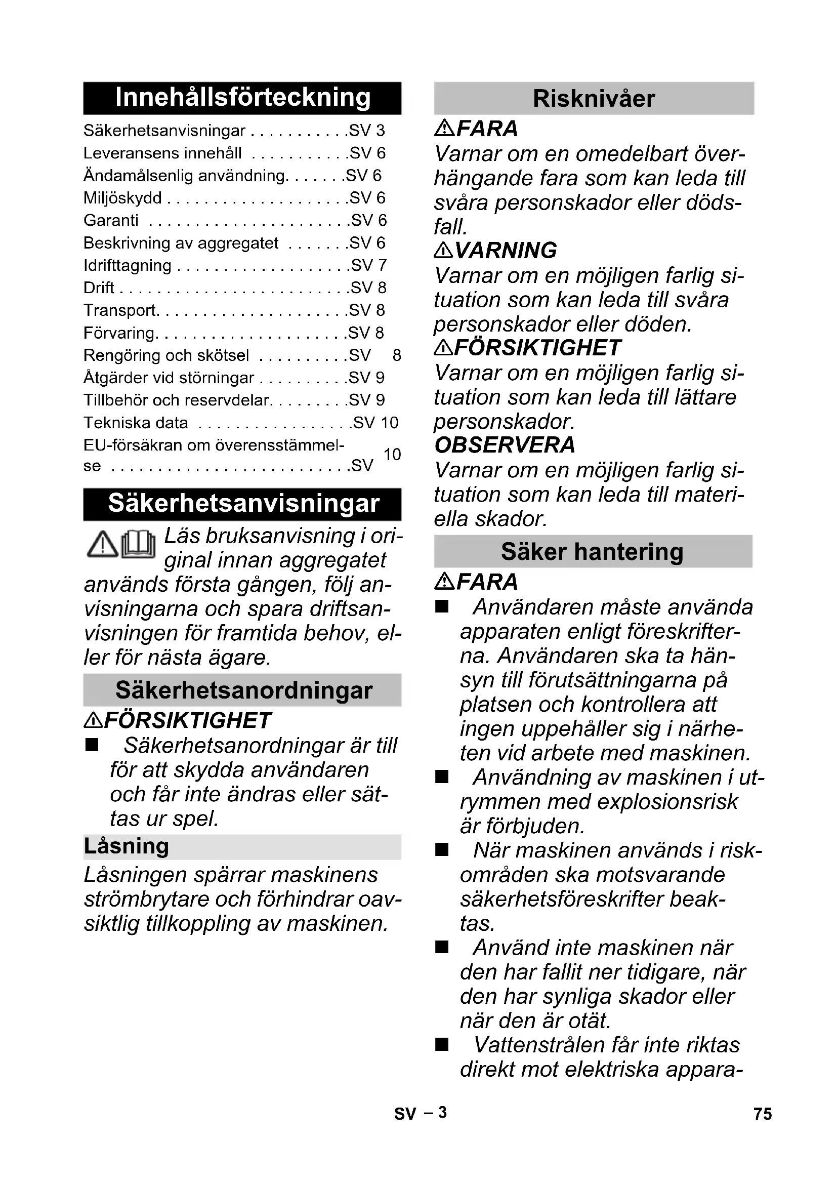84 dB(A) Battery Power 18/25 Batteritype Li-Ion Nominell spenning batteri 18 V = Nominell kapasitet (iht. IEC/EN 61690) 2,4 Ah Nominell kapasitet (iht. elementprodusentens opplysnin- ger) 2,5 Ah Nominell energi (iht. UN 3480) 43,2 Wh Tilførselsstrøm maks. 4 A Driftstemperatur -20...40 °C Oppladingstemperatur 0...40 °C Lagringstemperatur -20...60 °C Vekt 0,5 kg Mål (l x b x h) 133 x 88 x 50 mm Standard-ladeapparat BC 18 V Nettspenning 100-240 V Frekvens 50-60 Hz Strømopptak (maks.) 0,3 A Beskyttelsesklasse II Nominell spenning batteri 18 V = Ladestrøm maks. 0,5 A Ladetid (ved tom batteripakke) ca. 4 h Vekt (uten batteripakke) 0,16 kg EU-samsvarserklæring Produkt: Trykkvasker (batteridrevet) Type: 1.328-000 1.328-1xx Relevante EU-direktiver 2014/35/EU 2014/35/EU 2014/30/EU 2014/30/EU 2011/65/EU 2011/65/EU 2000/14/EF – Anvendte overensstemmende normer EN 60335–1 EN 60335–1 – EN 60335-2-29 EN 60335–2–54 EN 60335–2–54 EN 62233: 2008 EN 62233: 2008 EN 55014–1:2017 EN 55014–1:2017 EN 55014–2: 2015 EN 55014–2: 2015 – EN 61000–3–2: 2014 – EN 61000–3–3: 2013 EN 50581 EN 50581 Anvendt metode for samsvarsvurdering 2000/14/EF: Vedlegg V Lydeffektnivå dB(A) Målt: 82 Garantert: 84 Chairman of the Board of Management Director Regulatory Affairs & Certification 74 NO– 3 Läs bruksanvisning i ori- ginal innan aggregatet används första gången, följ an- visningarna och spara driftsan- visningen för framtida behov, el- ler för nästa ägare. 몇 FÖRSIKTIGHET Säkerhetsanordningar är till för att skydda användaren och får inte ändras eller sät- tas ur spel. Låsningen spärrar maskinens strömbrytare och förhindrar oav- siktlig tillkoppling av maskinen. FARA Varnar om en omedelbart över- hängande fara som kan leda till svåra personskador eller döds- fall. 몇 VARNING Varnar om en möjligen farlig si- tuation som kan leda till svåra personskador eller döden. 몇 FÖRSIKTIGHET Varnar om en möjligen farlig si- tuation som kan leda till lättare personskador. OBSERVERA Varnar om en möjligen farlig si- tuation som kan leda till materi- ella skador. FARA Användaren måste använda apparaten enligt föreskrifter- na. Användaren ska ta hän- syn till förutsättningarna på platsen och kontrollera att ingen uppehåller sig i närhe- ten vid arbete med maskinen. Användning av maskinen i ut- rymmen med explosionsrisk är förbjuden. När maskinen används i risk- områden ska motsvarande säkerhetsföreskrifter beak- tas. Använd inte maskinen när den har fallit ner tidigare, när den har synliga skador eller när den är otät. Vattenstrålen får inte riktas direkt mot elektriska appara- Innehållsförteckning Säkerhetsanvisningar . . . . . . . . . . .SV 3 Leveransens innehåll . . . . . . . . . . .SV 6 Ändamålsenlig användning. . . . . . .SV 6 Miljöskydd . . . . . . . . . . . . . . . . . . . .SV 6 Garanti . . . . . . . . . . . . . . . . . . . . . .SV 6 Beskrivning av aggregatet . . . . . . .SV 6 Idrifttagning . . . . . . . . . . . . . . . . . . .SV 7 Drift . . . . . . . . . . . . . . . . . . . . . . . . .SV 8 Transport. . . . . . . . . . . . . . . . . . . . .SV 8 Förvaring. . . . . . . . . . . . . . . . . . . . .SV 8 Rengöring och skötsel . . . . . . . . . .SV 8 Åtgärder vid störningar . . . . . . . . . .SV 9 Tillbehör och reservdelar. . . . . . . . .SV 9 Tekniska data . . . . . . . . . . . . . . . . .SV 10 EU-försäkran om överensstämmel- se . . . . . . . . . . . . . . . . . . . . . . . . . .SV