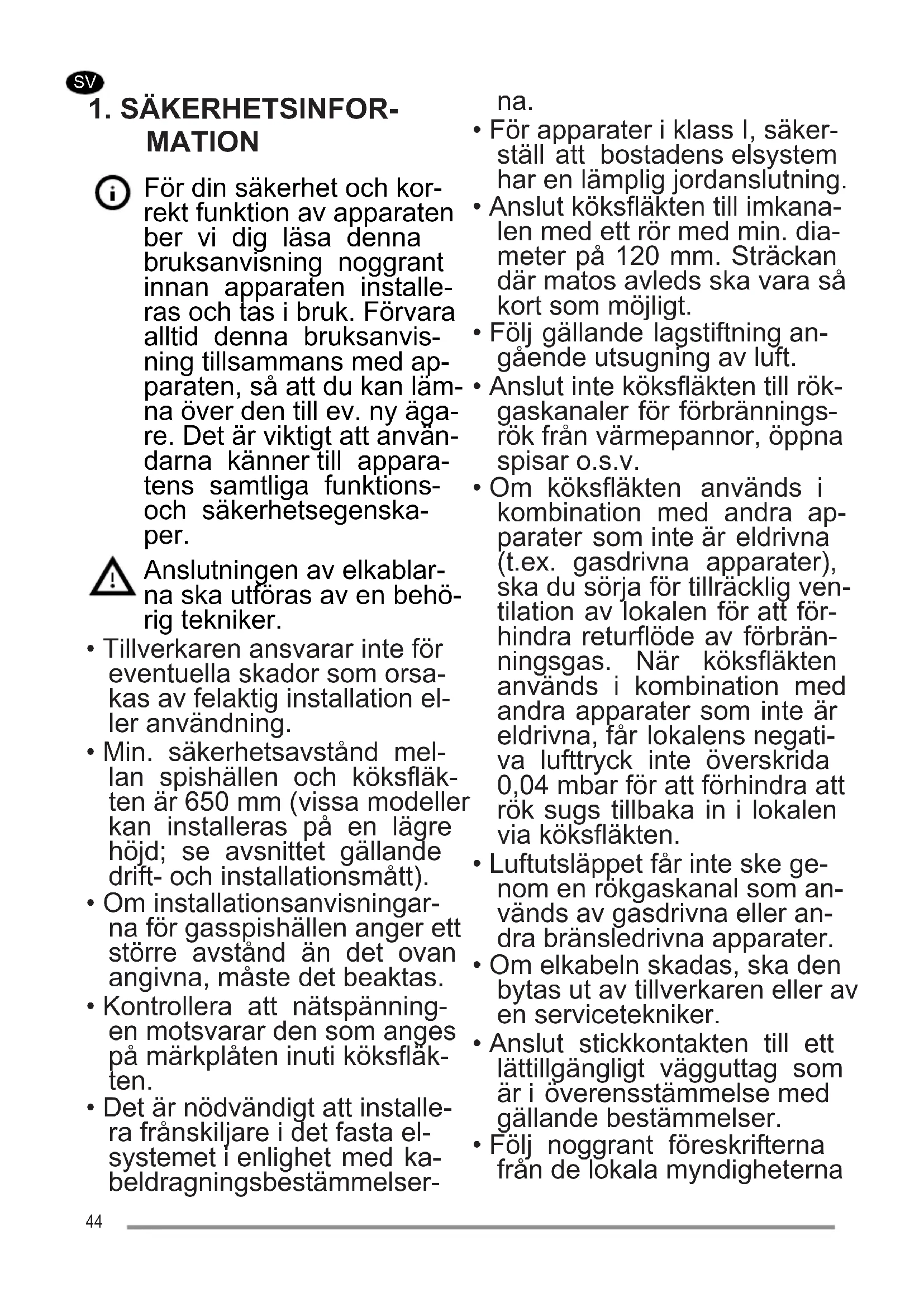 - Om köksfläkten används i kombination med andra ap- parater som inte är eldrivna (t.ex. gasdrivna apparater), ska du sörja för tillräcklig ven- tilation av lokalen för att för- hindra returflöde av förbrän- ningsgas. När köksfläkten används i kombination med andra apparater som inte är eldrivna, får lokalens negati- va lufttryck inte överskrida 0,04 mbar för att förhindra att rök sugs tillbaka in i lokalen via köksfläkten.