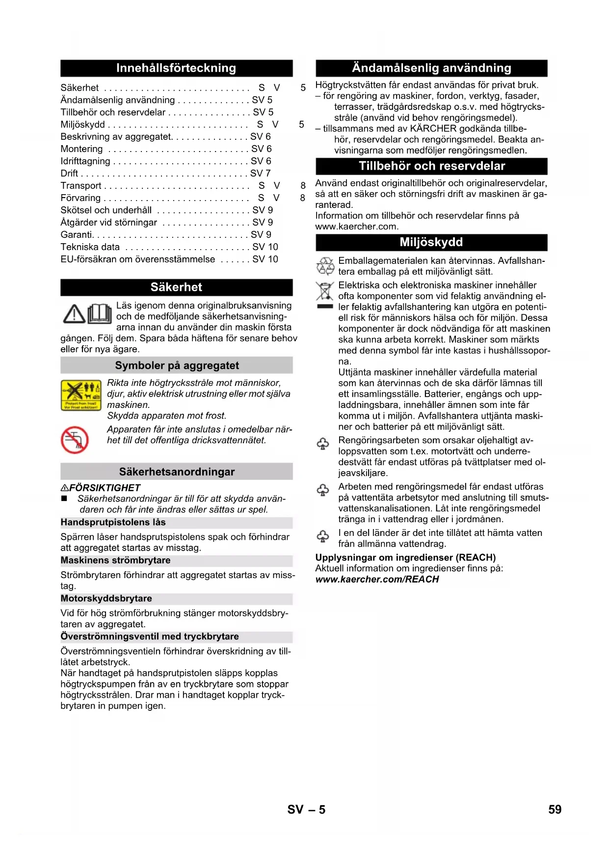 95 dB(A) Unntaksgrunn i henhold til forordning (EU) 2019/1781 vedlegg I avsnitt 2 (12): j) Det tas forbehold om tekniske endringer. EU-samsvarserklæring Produkt: Høytrykksvasker Type: K 6 Special Relevante EU-direktiver 2006/42/EF (+2009/127/EF) 2014/30/EU 2011/65/EU 2000/14/EF 2009/125/EU Anvendte direktiver (EU) 2019/1781 Anvendte overensstemmende normer EN 60335–1 EN 60335–2–79 EN 62233: 2008 EN 55014–1: 2017 + A11: 2020 EN 55014–2: 2015 EN 61000–3–2: 2014 EN 61000–3–11: 2000 EN IEC 63000: 2018 Anvendt metode for samsvarsvurdering 2000/14/EF: Vedlegg V Lydeffektnivå dB(A) Målt: 92 Garantert: 95 Winnenden, 2021/06/01 Chairman of the Board of Management Director Regulatory Affairs & Certification 58 NO– 5 Läs igenom denna originalbruksanvisning och de medföljande säkerhetsanvisning- arna innan du använder din maskin första gången. Följ dem. Spara båda häftena för senare behov eller för nya ägare. 몇 FÖRSIKTIGHET Säkerhetsanordningar är till för att skydda använ- daren och får inte ändras eller sättas ur spel. Spärren låser handsprutspistolens spak och förhindrar att aggregatet startas av misstag. Strömbrytaren förhindrar att aggregatet startas av miss- tag. Vid för hög strömförbrukning stänger motorskyddsbry- taren av aggregatet. Överströmningsventieln förhindrar överskridning av till- låtet arbetstryck. När handtaget på handsprutpistolen släpps kopplas högtryckspumpen från av en tryckbrytare som stoppar högtrycksstrålen. Drar man i handtaget kopplar tryck- brytaren in pumpen igen. Högtryckstvätten får endast användas för privat bruk. – för rengöring av maskiner, fordon, verktyg, fasader, terrasser, trädgårdsredskap o.s.v. med högtrycks- stråle (använd vid behov rengöringsmedel). – tillsammans med av KÄRCHER godkända tillbe- hör, reservdelar och rengöringsmedel. Beakta an- visningarna som medföljer rengöringsmedlen. Använd endast originaltillbehör och originalreservdelar, så att en säker och störningsfri drift av maskinen är ga- ranterad. Information om tillbehör och reservdelar finns på www.kaercher.com. Upplysningar om ingredienser (REACH) Aktuell information om ingredienser finns på: www.kaercher.com/REACH Innehållsförteckning Säkerhet . . . . . . . . . . . . . . . . . . . . . . . . . . . .SV 5 Ändamålsenlig användning . . . . . . . . . . . . . . SV 5 Tillbehör och reservdelar . . . . . . . . . . . . . . . . SV 5 Miljöskydd . . . . . . . . . . . . . . . . . . . . . . . . . . .SV 5 Beskrivning av aggregatet. . . . . . . . . . . . . . . SV 6 Montering . . . . . . . . . . . . . . . . . . . . . . . . . . . SV 6 Idrifttagning . . . . . . . . . . . . . . . . . . . . . . . . . . SV 6 Drift . . . . . . . . . . . . . . . . . . . . . . . . . . . . . . . . SV 7 Transport . . . . . . . . . . . . . . . . . . . . . . . . . . . .SV 8 Förvaring . . . . . . . . . . . . . . . . . . . . . . . . . . . .SV 8 Skötsel och underhåll . . . . . . . . . . . . . . . . . . SV 9 Åtgärder vid störningar . . . . . . . . . . . . . . . . . SV 9 Garanti. . . . . . . . . . . . . . . . . . . . . . . . . . . . . . SV 9 Tekniska data . . . . . . . . . . . . . . . . . . . . . . . . SV 10 EU-försäkran om överensstämmelse . . . . . . SV 10 Säkerhet Symboler på aggregatet Rikta inte högtrycksstråle mot människor, djur, aktiv elektrisk utrustning eller mot själva maskinen. Skydda apparaten mot frost. Apparaten får inte anslutas i omedelbar när- het till det offentliga dricksvattennätet. Säkerhetsanordningar Handsprutpistolens lås Maskinens strömbrytare Motorskyddsbrytare Överströmningsventil med tryckbrytare Ändamålsenlig användning Tillbehör och reservdelar Miljöskydd Emballagematerialen kan återvinnas. Avfallshan- tera emballag på ett miljövänligt sätt. Elektriska och elektroniska maskiner innehåller ofta komponenter som vid felaktig användning el- ler felaktig avfallshantering kan utgöra en potenti- ell risk för människors hälsa och för miljön. Dessa komponenter är dock nödvändiga för att maskinen ska kunna arbeta korrekt. Maskiner som märkts med denna symbol får inte kastas i hushållssopor- na. Uttjänta maskiner innehåller värdefulla material som kan återvinnas och de ska därför lämnas till ett insamlingsställe. Batterier, engångs och upp- laddningsbara, innehåller ämnen som inte får komma ut i miljön. Avfallshantera uttjänta maski- ner och batterier på ett miljövänligt sätt. Rengöringsarbeten som orsakar oljehaltigt av- loppsvatten som t.ex. motortvätt och underre- destvätt får endast utföras på tvättplatser med ol- jeavskiljare. Arbeten med rengöringsmedel får endast utföras på vattentäta arbetsytor med anslutning till smuts- vattenskanalisationen. Låt inte rengöringsmedel tränga in i vattendrag eller i jordmånen. I en del länder är det inte tillåtet att hämta vatten från allmänna vattendrag. 59SV– 6 Aggregatets leveransomfång är avbildat på förpack- ningen. Kontrollera att innehållet i leveransen är full- ständig. Kontakta din försäljare om något tillbehör saknas eller om det finns transportskador. Bilder, se sida 2 1 Vattenanslutning med inbyggt filter 2 Kopplingsdel för vattenanslutning 3 Snabbkoppling till högtrycksslang 4 Förvaring för högtrycksspruta 5 Strömbrytare "0/OFF / I/ON" 6 Doseringsreglage för rengöringsmedel 7 Förvaring för högtrycksspruta 8 Transporthandtag 9 Plug 'n' Clean rengöringsmedelsflaska med förslut- ningslock 10 Förvaring Plug 'n' Clean rengöringsmedelsflaska med anslutning för rengöringsmedel 11 Förvaring för högtrycksslang 12 Förvaring för stålrör 13 Förvaringskrok för nätkabel 14 Nätkabel med nätkontakt 15 Transporthjul 16 Högtrycksspruta 17 Handsprutpistolens lås 18 Knapp för att ta loss högtrycksslangen från hand- sprutpistolen 19 Högtrycksslang 20 Spolrör med rotojet Vid hårt fastsittande smuts 21 Spolrör med tryckreglering (Vario Power) För de 