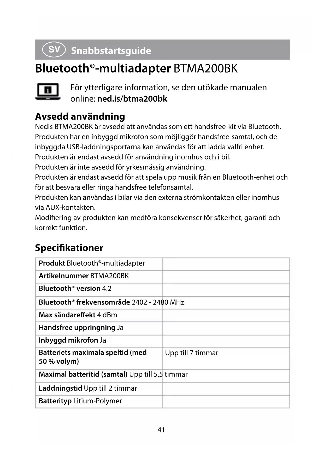 Snabbstartsguide Bluetooth®-multiadapter BTMA200BK För ytterligare information, se den utökade manualen online: ned.is/btma200bk Avsedd användning Nedis BTMA200BK är avsedd att användas som ett handsfree-kit via Bluetooth. Produkten har en inbyggd mikrofon som möjliggör handsfree-samtal, och de inbyggda USB-laddningsportarna kan användas för att ladda valfri enhet. Produkten är endast avsedd för användning inomhus och i bil. Produkten är inte avsedd för yrkesmässig användning. Produkten är endast avsedd för att spela upp musik från en Bluetooth-enhet och för att besvara eller ringa handsfree telefonsamtal. Produkten kan användas i bilar via den externa strömkontakten eller inomhus via AUX-kontakten. Modifiering av produkten kan medföra konsekvenser för säkerhet, garanti och korrekt funktion. Specikationer Produkt Bluetooth®-multiadapter Artikelnummer BTMA200BK Bluetooth® version 4.2 Bluetooth® frekvensområde 2402 - 2480 MHz Max sändareekt 4 dBm Handsfree uppringning Ja Inbyggd mikrofon Ja Batteriets maximala speltid (med 50 % volym) Upp till 7 timmar Maximal batteritid (samtal) Upp till 5,5 timmar Laddningstid Upp till 2 timmar Batterityp Litium-Polymer42 Batterikapacitet 300 mAh USB laddningsutgång 2 x 5.0 V / 2,4 A Anslutningar AUX-ingång Huvuddelar (bild A)