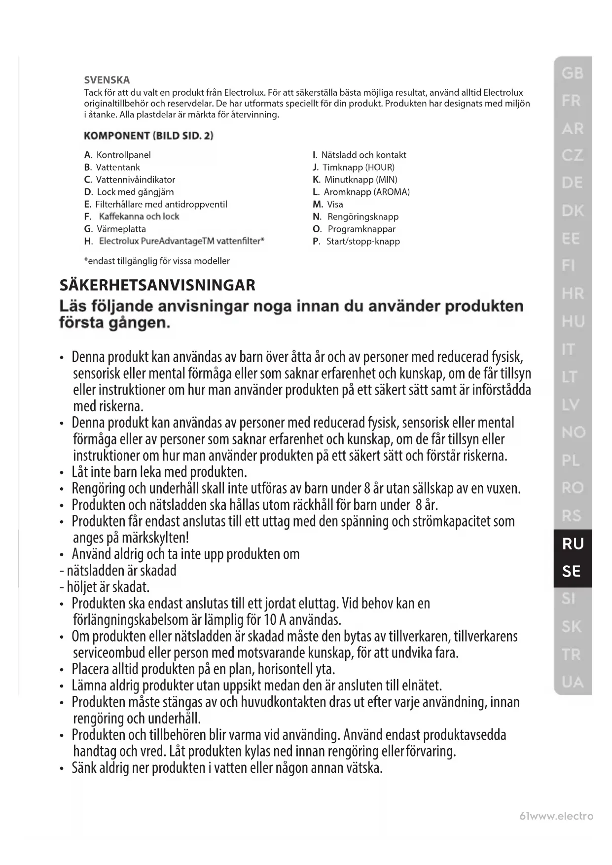J. Timknapp (HOUR) K. Minutknapp (MIN) L. Aromknapp (AROMA) M. Visa N. Rengöringsknapp O. Programknappar P. Start/stopp-knapp *endast tillgänglig för vissa modeller SÄKERHETSANVISNINGAR