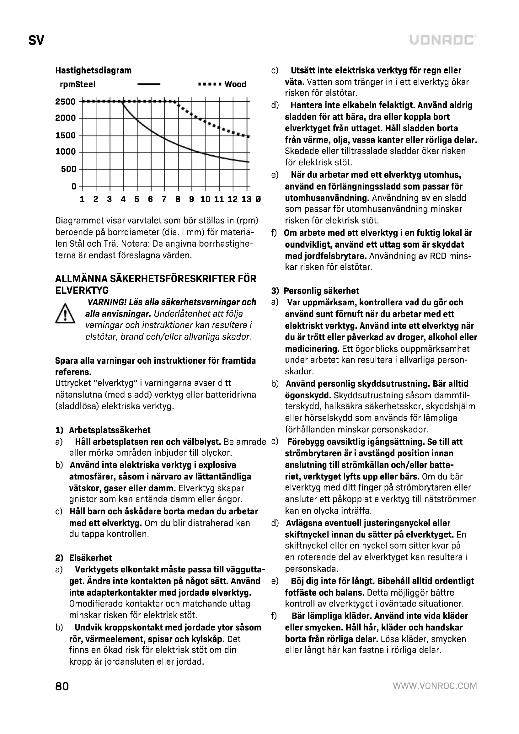 1 2 3 4 5 6 7 8 9 10 11 12 13 Ø Wood Diagrammet visar varvtalet som bör ställas in (rpm) beroende på borrdiameter (dia. i mm) för materia- len Stål och Trä. Notera: De angivna borrhastighe- terna är endast föreslagna värden. ALLMÄNNA SÄKERHETSFÖRESKRIFTER FÖR ELVERKTYG VARNING! Läs alla säkerhetsvarningar och alla anvisningar. Underlåtenhet att följa varningar och instruktioner kan resultera i elstötar, brand och/eller allvarliga skador. Spara alla varningar och instruktioner för framtida referens. Uttrycket ”elverktyg” i varningarna avser ditt nätanslutna (med sladd) verktyg eller batteridrivna (sladdlösa) elektriska verktyg.