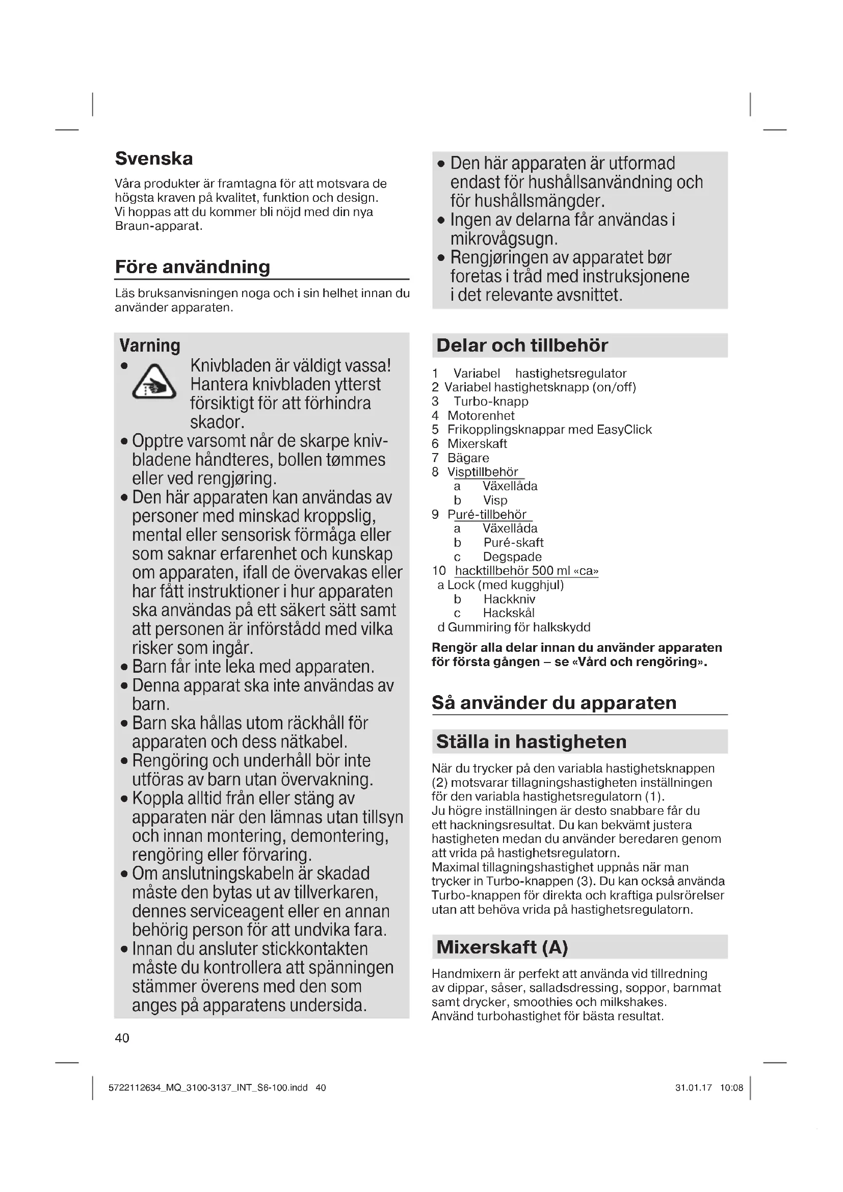 Rengjøringen av apparatet bør foretas i tråd med instruksjonene i det relevante avsnittet. Delar och tillbehör 1 Variabel hastighetsregulator 2 Variabel hastighetsknapp (on/off) 3 Turbo-knapp 4 Motorenhet 5 Frikopplingsknappar med EasyClick 6 Mixerskaft 7 Bägare 8 Visptillbehör a Växellåda b Visp 9 Puré-tillbehör a Växellåda b Puré-skaft c Degspade 10 hacktillbehör 500 ml «ca» a Lock (med kugghjul) b Hackkniv c Hackskål d Gummiring för halkskydd Rengör alla delar innan du använder apparaten för första gången – se «Vård och rengöring». Så använder du apparaten Ställa in hastigheten När du trycker på den variabla hastighetsknappen (2) motsvarar tillagningshastigheten inställningen för den variabla hastighetsregulatorn (1). Ju högre inställningen är desto snabbare får du ett hackningsresultat. Du kan bekvämt justera hastigheten medan du använder beredaren genom att vrida på hastighetsregulatorn. Maximal tillagningshastighet uppnås när man trycker in Turbo-knappen (3). Du kan också använda Turbo-knappen för direkta och kraftiga pulsrörelser utan att behöva vrida på hastighetsregulatorn. Mixerskaft (A) Handmixern är perfekt att använda vid tillredning av dippar, såser, salladsdressing, soppor, barnmat samt drycker, smoothies och milkshakes. Använd turbohastighet för bästa resultat. 5722112634_MQ_3100-3137_INT_S6-100.indd 405722112634_MQ_3100-3137_INT_S6-100.indd 40 31.01.17 10:0831.01.17 10:0841 Montering och hantering