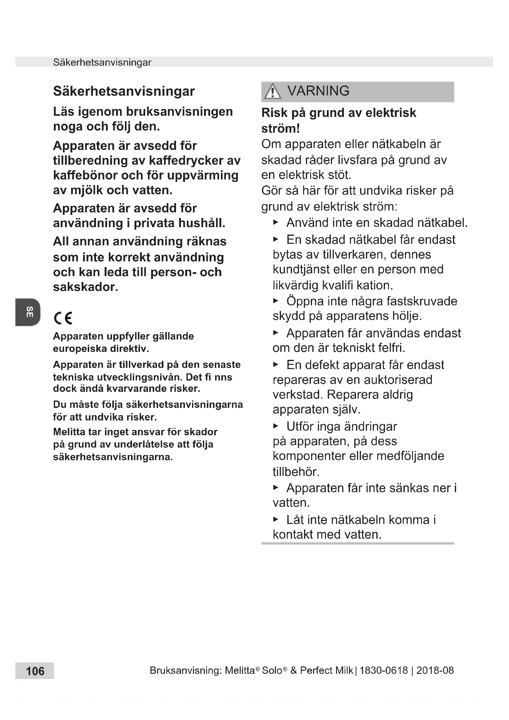 Säkerhetsanvisningar Läs igenom bruksanvisningen noga och följ den. Apparaten är avsedd för tillberedning av kaffedrycker av kaffebönor och för uppvärming av mjölk och vatten. Apparaten är avsedd för användning i privata hushåll. All annan användning räknas som inte korrekt användning och kan leda till person- och sakskador. Apparaten uppfyller gällande europeiska direktiv. Apparaten är tillverkad på den senaste tekniska utvecklingsnivån. Det fi nns dock ändå kvarvarande risker. Du måste följa säkerhetsanvisningarna för att undvika risker. Melitta tar inget ansvar för skador på grund av underlåtelse att följa säkerhetsanvisningarna. VARNING Risk på grund av elektrisk ström! Om apparaten eller nätkabeln är skadad råder livsfara på grund av en elektrisk stöt. Gör så här för att undvika risker på grund av elektrisk ström: ▶ Använd inte en skadad nätkabel. ▶ En skadad nätkabel får endast bytas av tillverkaren, dennes kundtjänst eller en person med likvärdig kvalifi kation. ▶ Öppna inte några fastskruvade skydd på apparatens hölje. ▶ Apparaten får användas endast om den är tekniskt felfri. ▶ En defekt apparat får endast repareras av en auktoriserad verkstad. Reparera aldrig apparaten själv. ▶ Utför inga ändringar på apparaten, på dess komponenter eller medföljande tillbehör. ▶ Apparaten får inte sänkas ner i vatten. ▶ Låt inte nätkabeln komma i kontakt med vatten.Bruksanvisning: Melitta
