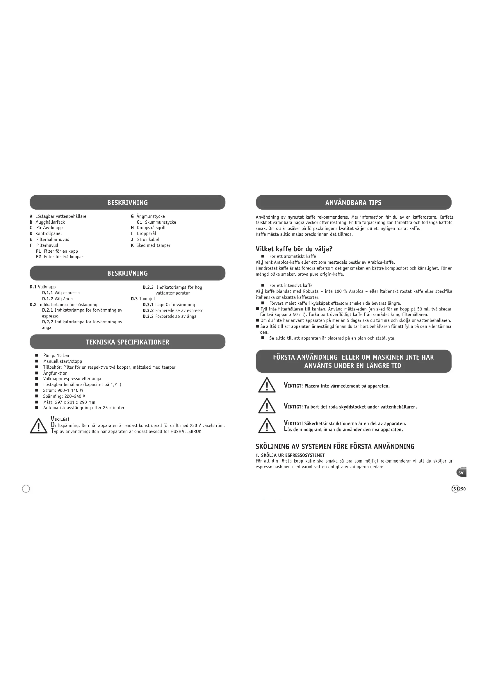 För att din första kopp kaffe ska smaka så bra som möjligt rekommenderar vi att du sköljer ur espressomaskinen med varmt vatten enligt anvisningarna nedan: TEKNISKA SPECIFIKATIONER Pump: 15 bar Manuell start/stopp Tillbehör: Filter för en respektive två koppar, måttsked med tamper Ångfunktion Valknapp: espresso eller ånga Löstagbar behållare (kapacitet på 1,2 l) Ström: 960–1 140 W Spänning: 220–240 V Mått: 297 x 201 x 290 mm Automatisk avstängning efter 25 minuter VIKTIGT! Driftspänning: Den här apparaten är endast konstruerad för drift med 230 V växelström. Typ av användning: Den här apparaten är endast avsedd för HUSHÅLLSBRUK BESKRIVNING A Löstagbar vattenbehållare B Mugghållarfack C På-/av-knapp D Kontrollpanel E Filterhållarhuvud F Filterhuvud F1 Filter för en kopp F2 Filter för två koppar G Ångmunstycke G1 Skummunstycke H Droppskålsgrill I Droppskål J Strömkabel K Sked med tamper BESKRIVNING D.1 Valknapp D.1.1 Välj espresso D.1.2 Välj ånga D.2 Indikatorlampa för påslagning D.2.1 Indikatorlampa för förvärmning av espresso D.2.2 Indikatorlampa för förvärmning av ånga D.2.3 Indikatorlampa för hög vattentemperatur D.3 Tumhjul D.3.1 Läge O: förvärmning D.3.2 Förberedelse av espresso D.3.3 Förberedelse av ånga253252