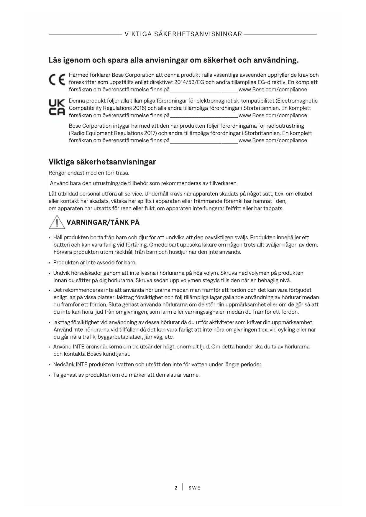 SWE Läs igenom och spara alla anvisningar om säkerhet och användning. Härmed förklarar Bose Corporation att denna produkt i alla väsentliga avseenden uppfyller de krav och föreskrifter som uppställts enligt direktivet 2014/53/EG och andra tillämpliga EG-direktiv. En komplett försäkran om överensstämmelse finns på www.Bose.com/compliancewww.Bose.com/compliance Denna produkt följer alla tillämpliga förordningar för elektromagnetisk kompatibilitet (Electromagnetic Compatibility Regulations 2016) och alla andra tillämpliga förordningar i Storbritannien. En komplett försäkran om överensstämmelse finns på www.Bose.com/compliancewww.Bose.com/compliance Bose Corporation intygar härmed att den här produkten följer förordningarna för radioutrustning (Radio Equipment Regulations 2017) och andra tillämpliga förordningar i Storbritannien. En komplett försäkran om överensstämmelse finns på www.Bose.com/compliancewww.Bose.com/compliance Viktiga säkerhetsanvisningar Rengör endast med en torr trasa. Använd bara den utrustning/de tillbehör som rekommenderas av tillverkaren. Låt utbildad personal utföra all service. Underhåll krävs när apparaten skadats på något sätt, t.ex. om elkabel eller kontakt har skadats, vätska har spillts i apparaten eller främmande föremål har hamnat i den, om apparaten har utsatts för regn eller fukt, om apparaten inte fungerar felfritt eller har tappats.