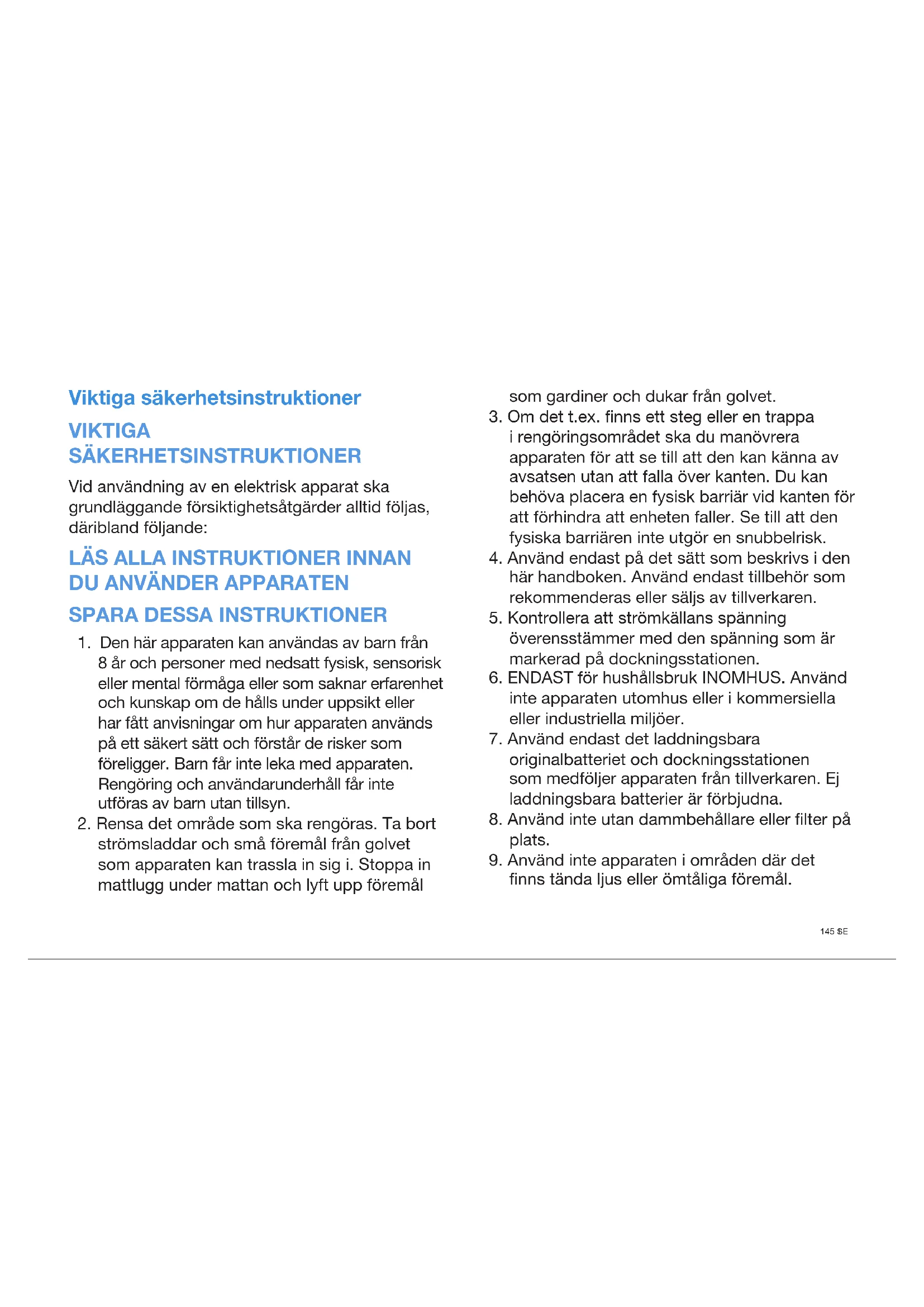 Viktiga säkerhetsinstruktioner VIKTIGA SÄKERHETSINSTRUKTIONER Vid användning av en elektrisk apparat ska grundläggande försiktighetsåtgärder alltid följas, däribland följande: