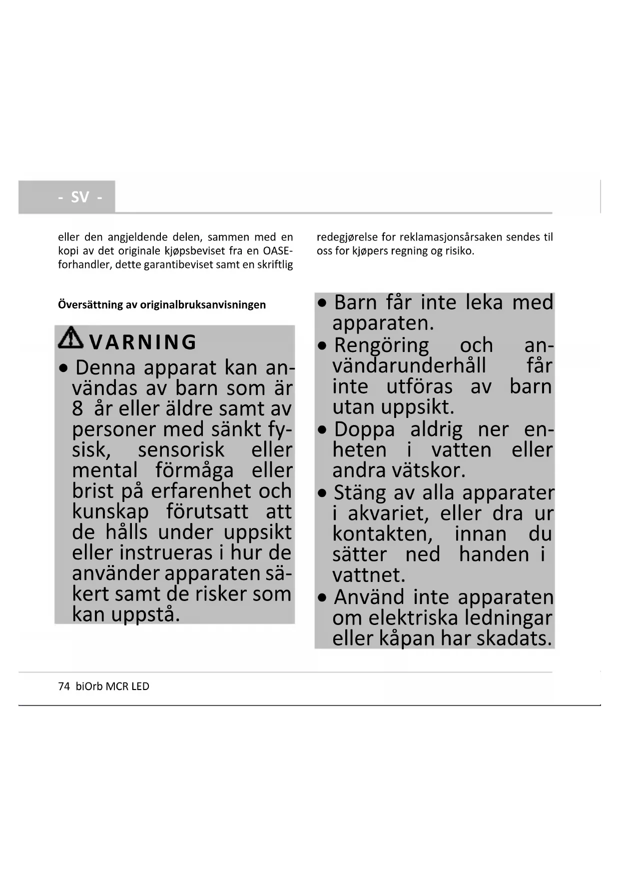 - SV - Översättning av originalbruksanvisningen VARNING