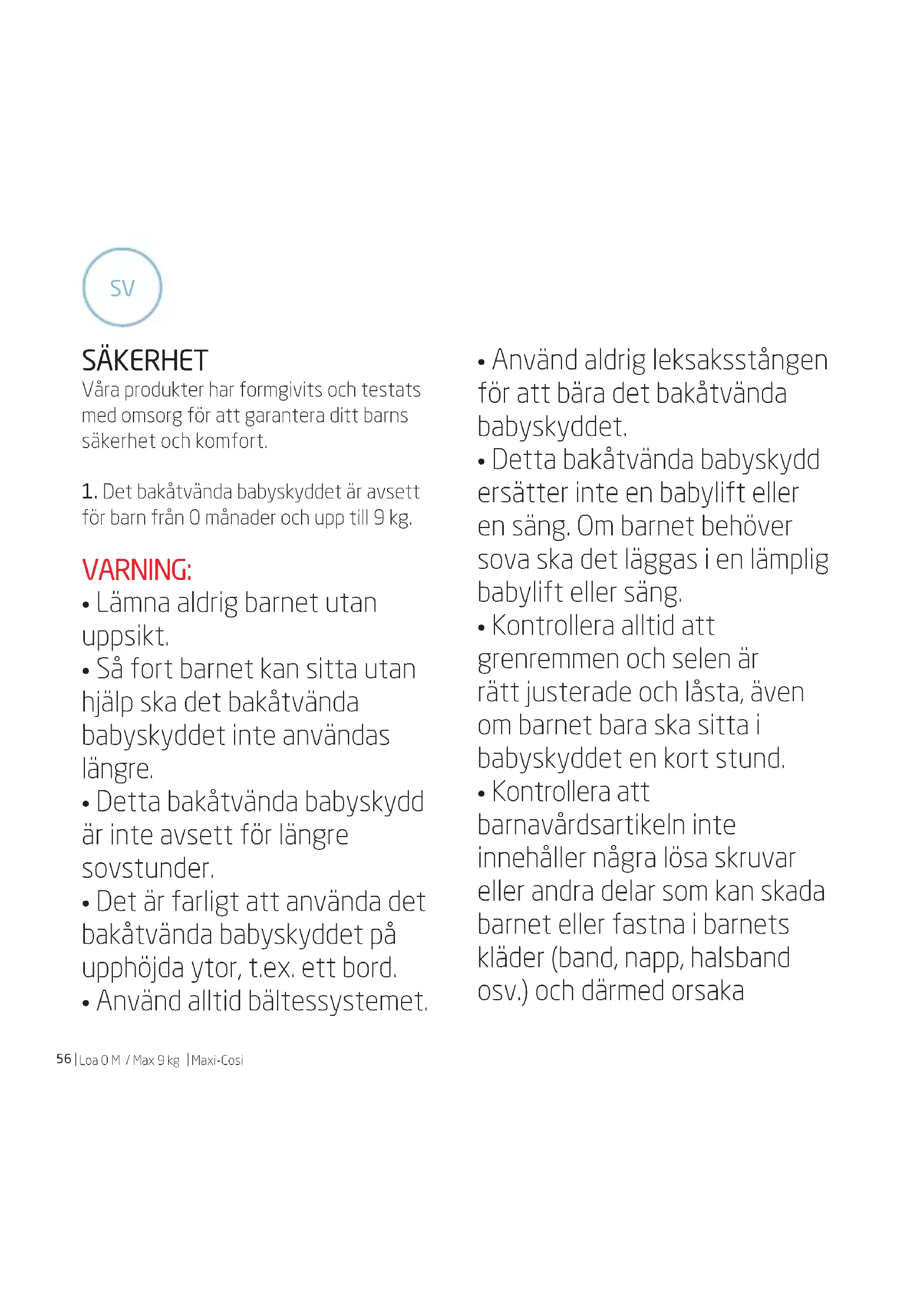 - Kontrollera att barnavårdsartikeln inte innehåller några lösa skruvar eller andra delar som kan skada barnet eller fastna i barnets kläder (band, napp, halsband osv.) och därmed orsaka SVMaxi-Cosi