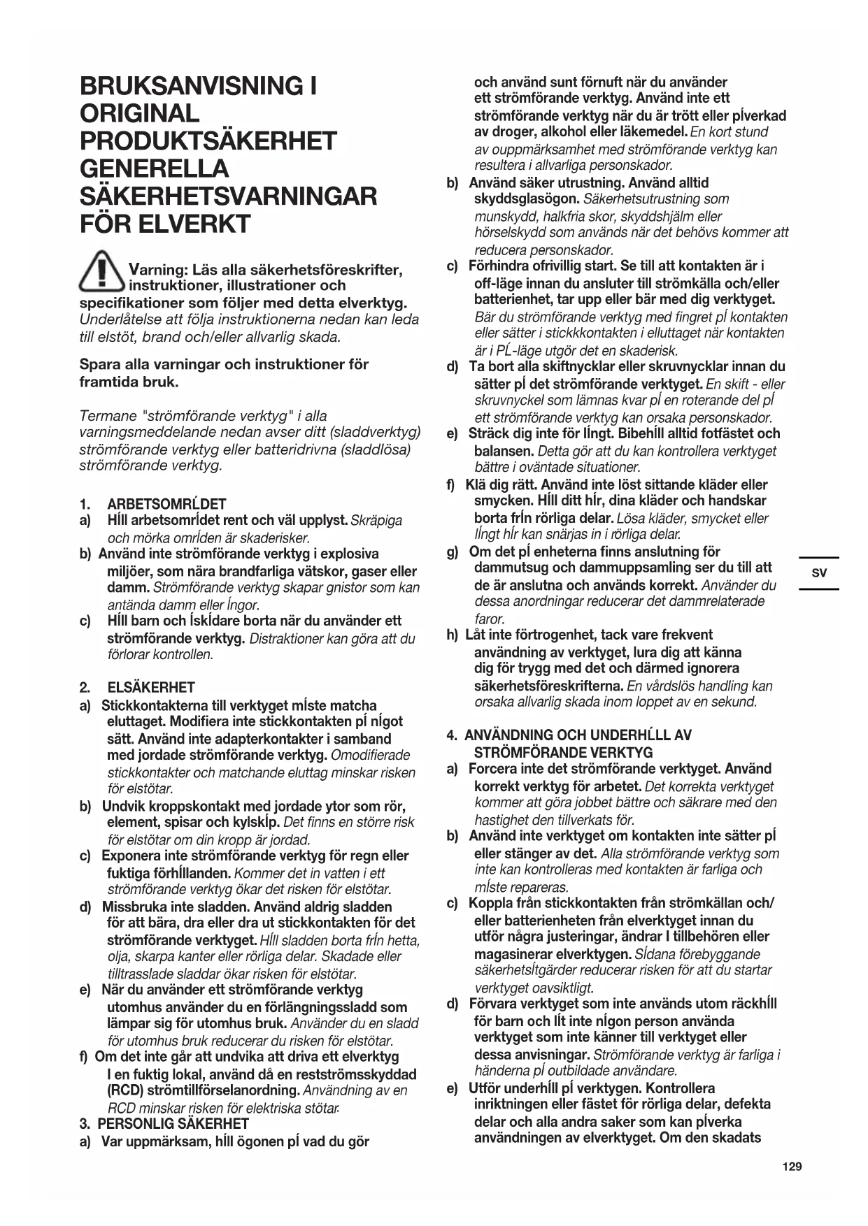a) Stickkontakterna till verktyget mĺste matcha eluttaget. Modifiera inte stickkontakten pĺ nĺgot sätt. Använd inte adapterkontakter i samband med jordade strömförande verktyg. Omodierade stickkontakter och matchande eluttag minskar risken för elstötar. b) Undvik kroppskontakt med jordade ytor som rör, element, spisar och kylskĺp. Det nns en större risk för elstötar om din kropp är jordad. c) Exponera inte strömförande verktyg för regn eller fuktiga förhĺllanden. Kommer det in vatten i ett strömförande verktyg ökar det risken för elstötar. d) Missbruka inte sladden. Använd aldrig sladden för att bära, dra eller dra ut stickkontakten för det strömförande verktyget. Hĺll sladden borta frĺn hetta, olja, skarpa kanter eller rörliga delar. Skadade eller tilltrasslade sladdar ökar risken för elstötar. e) När du använder ett strömförande verktyg utomhus använder du en förlängningssladd som lämpar sig för utomhus bruk. Använder du en sladd för utomhus bruk reducerar du risken för elstötar. f) Om det inte går att undvika att driva ett elverktyg I en fuktig lokal, använd då en restströmsskyddad (RCD) strömtillförselanordning. Användning av en RCD minskar risken för elektriska stötar