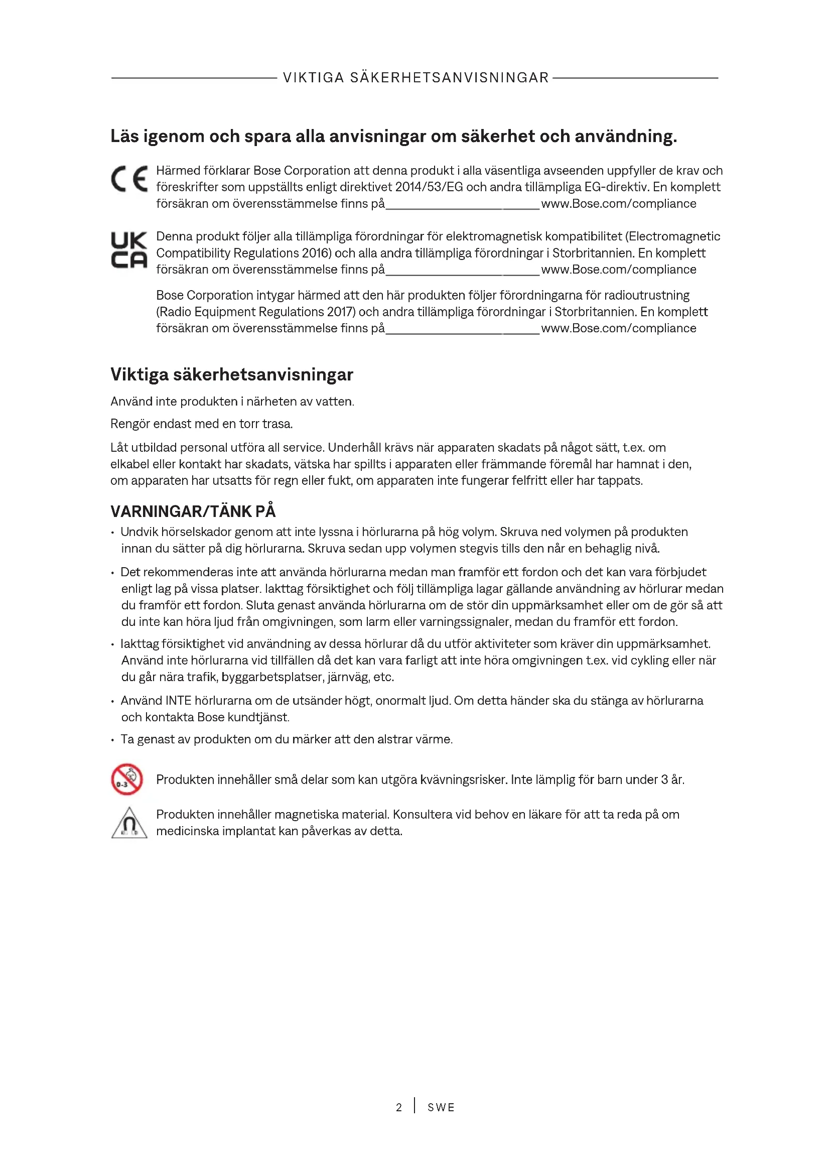 SWE Läs igenom och spara alla anvisningar om säkerhet och användning. Härmed förklarar Bose Corporation att denna produkt i alla väsentliga avseenden uppfyller de krav och föreskrifter som uppställts enligt direktivet 2014/53/EG och andra tillämpliga EG-direktiv. En komplett försäkran om överensstämmelse finns på www.Bose.com/compliancewww.Bose.com/compliance Denna produkt följer alla tillämpliga förordningar för elektromagnetisk kompatibilitet (Electromagnetic Compatibility Regulations 2016) och alla andra tillämpliga förordningar i Storbritannien. En komplett försäkran om överensstämmelse finns på www.Bose.com/compliancewww.Bose.com/compliance Bose Corporation intygar härmed att den här produkten följer förordningarna för radioutrustning (Radio Equipment Regulations 2017) och andra tillämpliga förordningar i Storbritannien. En komplett försäkran om överensstämmelse finns på www.Bose.com/compliancewww.Bose.com/compliance Viktiga säkerhetsanvisningar Använd inte produkten i närheten av vatten. Rengör endast med en torr trasa. Låt utbildad personal utföra all service. Underhåll krävs när apparaten skadats på något sätt, t.ex. om elkabel eller kontakt har skadats, vätska har spillts i apparaten eller främmande föremål har hamnat i den, om apparaten har utsatts för regn eller fukt, om apparaten inte fungerar felfritt eller har tappats.